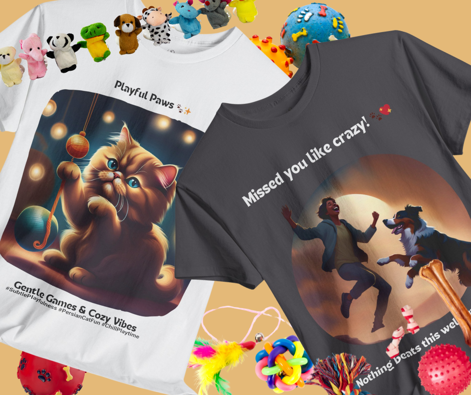 - Relatable and Heartwarming: The "Missed You Like Crazy" t-shirt perfectly captures the joy of reuniting with a dog, while the "Playful Paws" t-shirt reflects the lively spirit of a Persian kitten at play. Both designs speak directly to the hearts of pet owners.