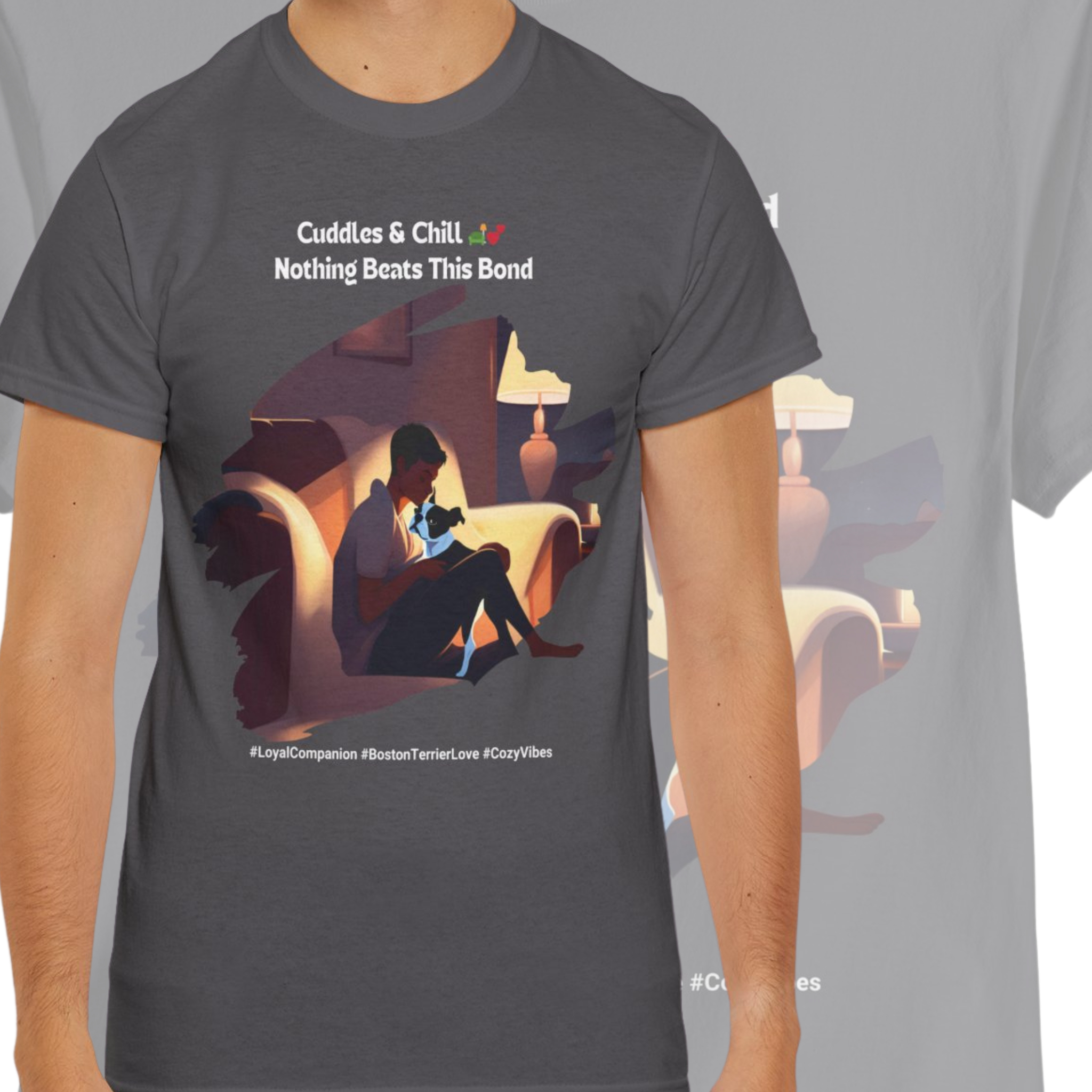 Men’s “Cozy Vibes: Boston Terrier Snuggles” T‑Shirt – Warm Pup Dad Gift
