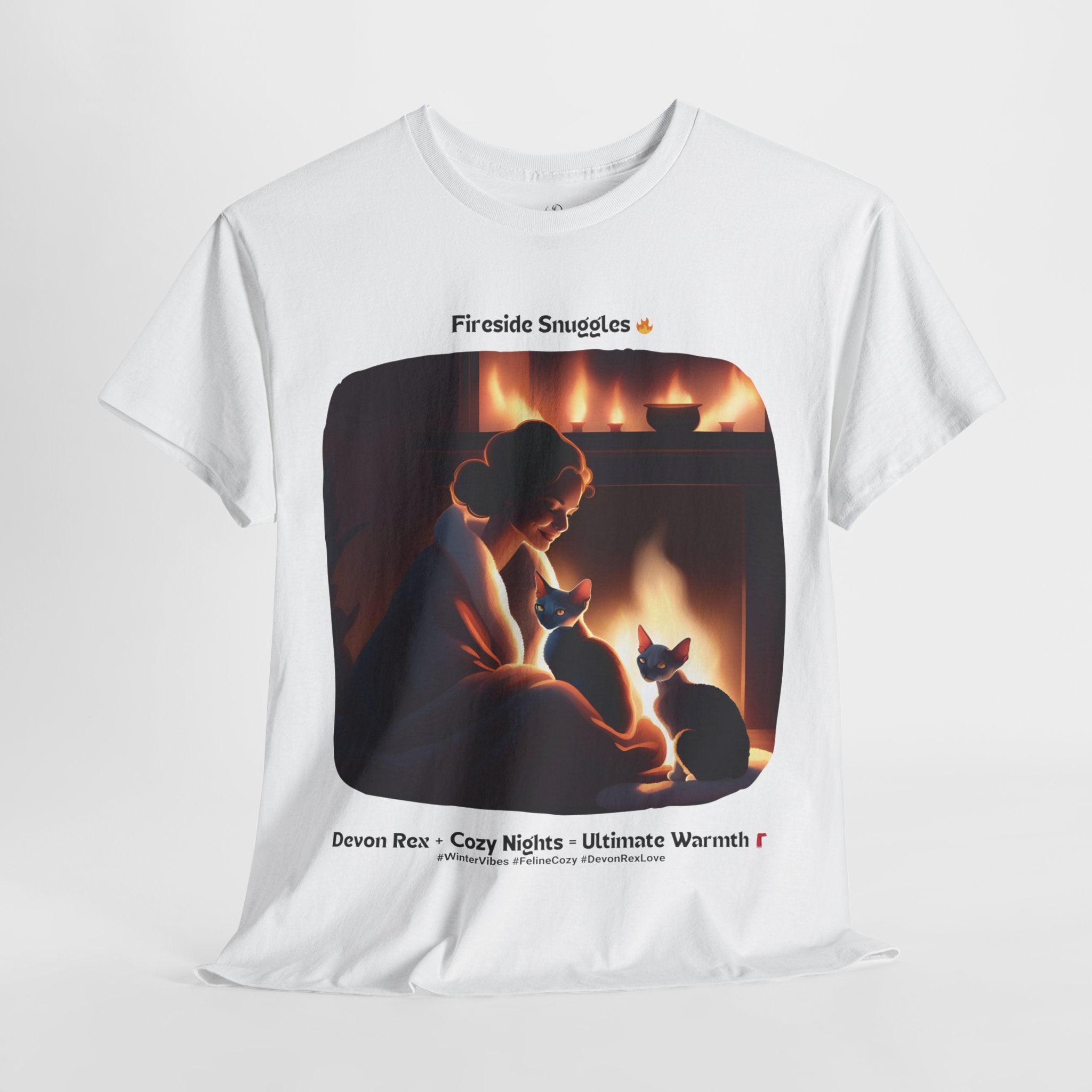 Women’s “Fireside Snuggles with Devon Rex” T‑Shirt – Cozy Cat Mom Gift