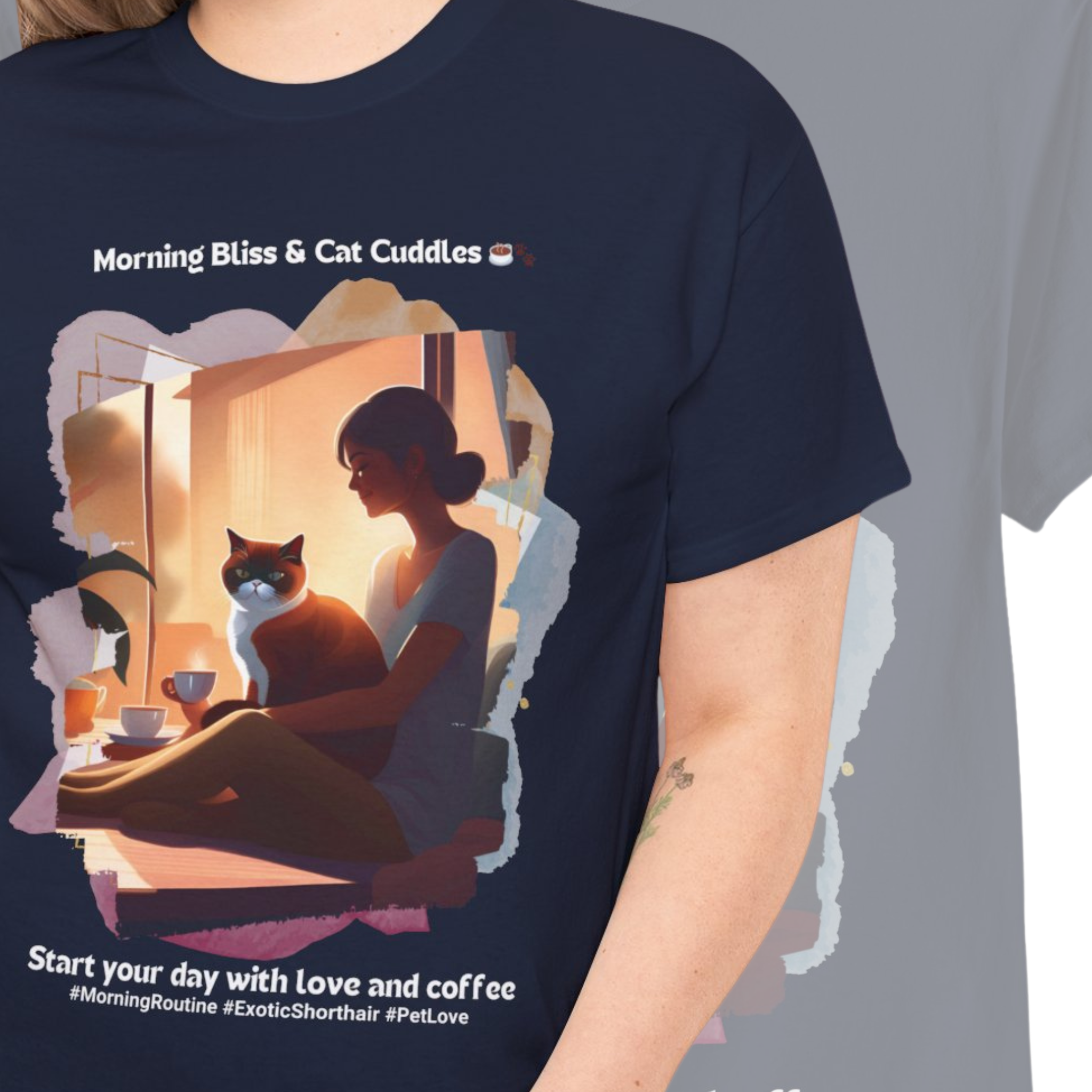 Women’s “Morning Bliss & Cat Cuddles” Exotic Shorthair T‑Shirt – Cuddle Cat Mom Gift