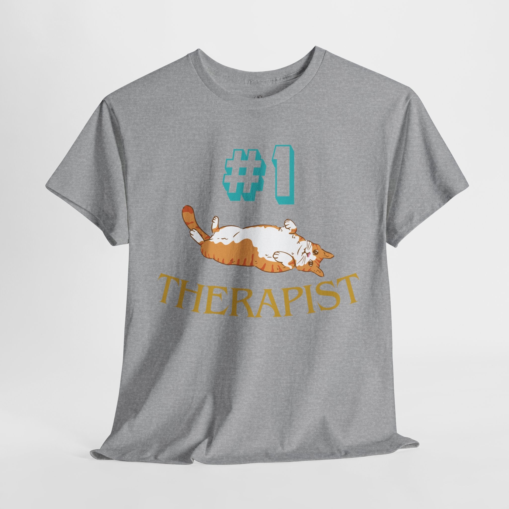 This playful t-shirt features a happy cat sprawled out, with the text "#1 Therapist" printed above. The design captures the comforting and therapeutic presence of cats, reminding us of the positive impact they have on our mental well-being.