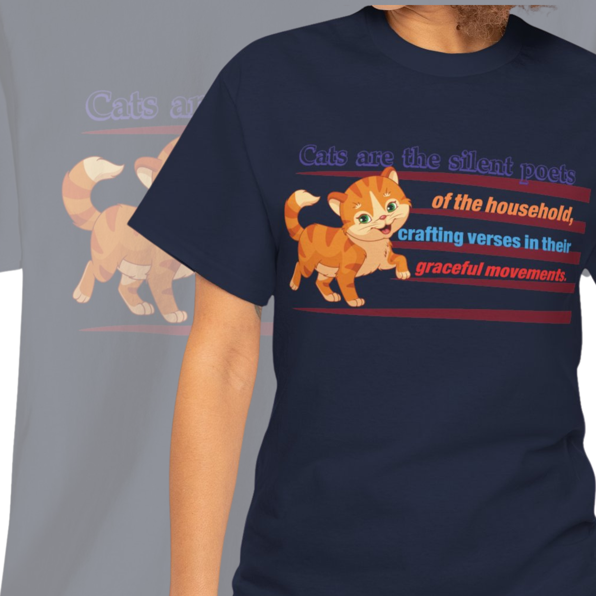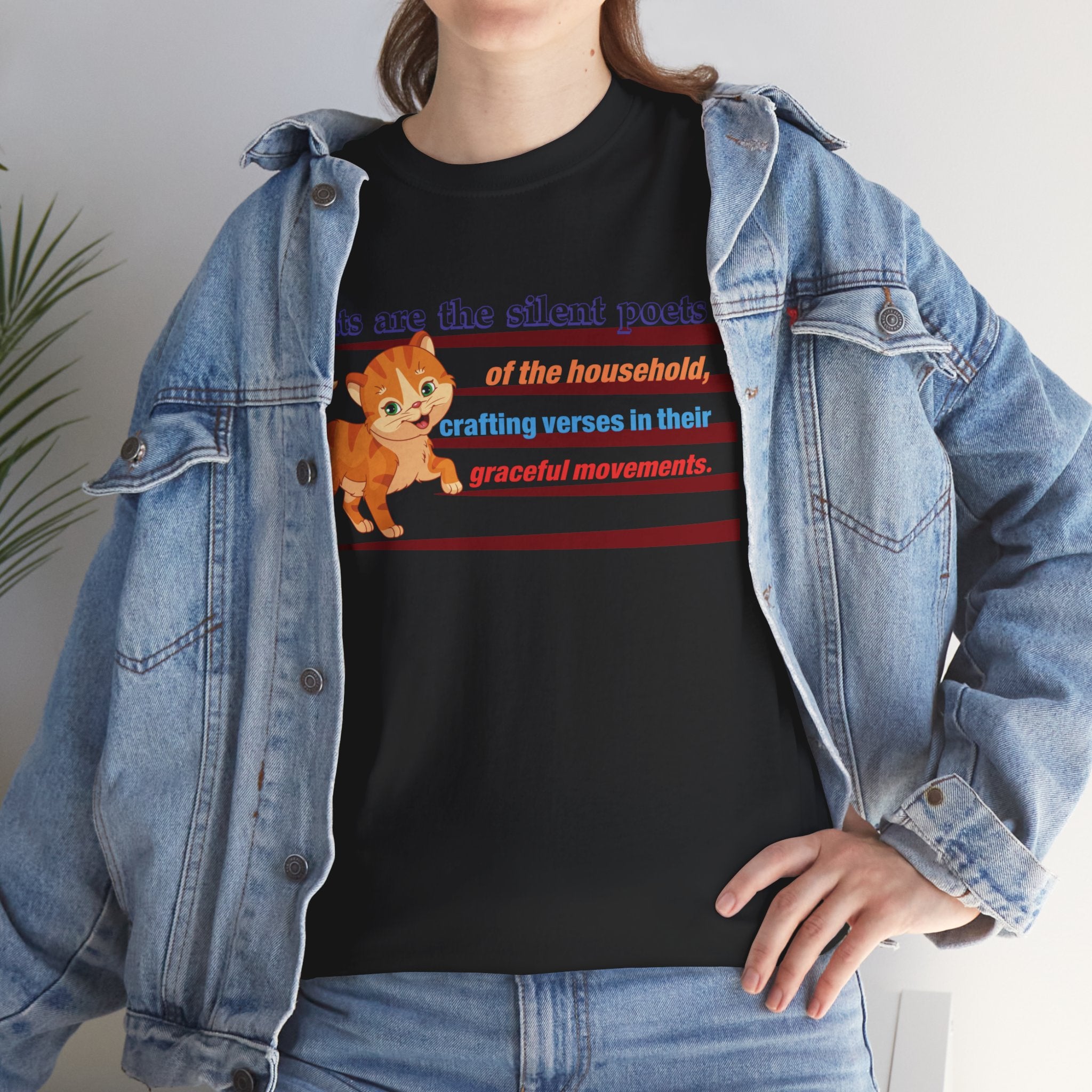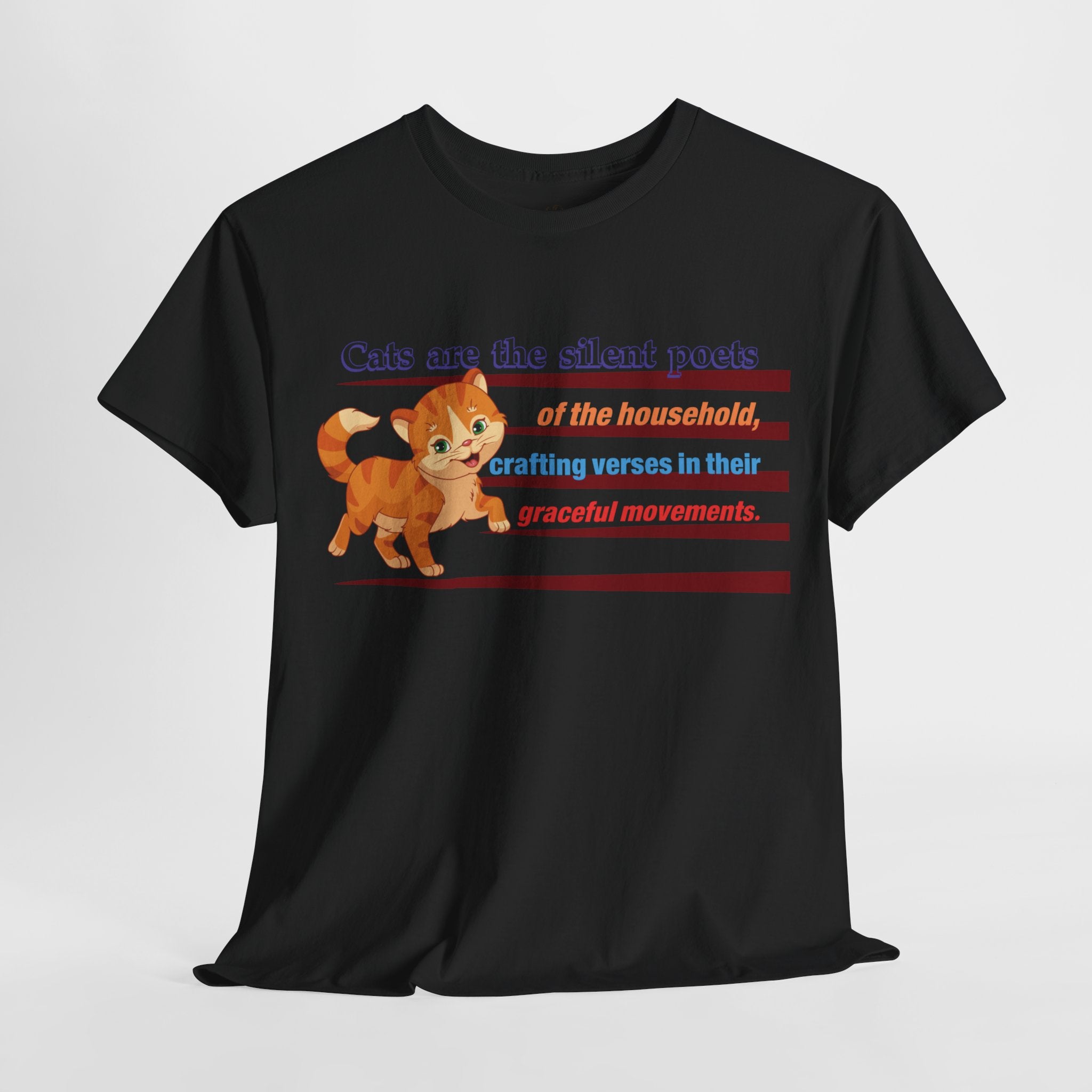 This elegant t-shirt features a silhouette of a graceful cat, accompanied by the text "Cats are the silent poets of the household, crafting verses in their graceful movements." The design captures the beauty and elegance of cats, reminding us to appreciate the simple things in life.