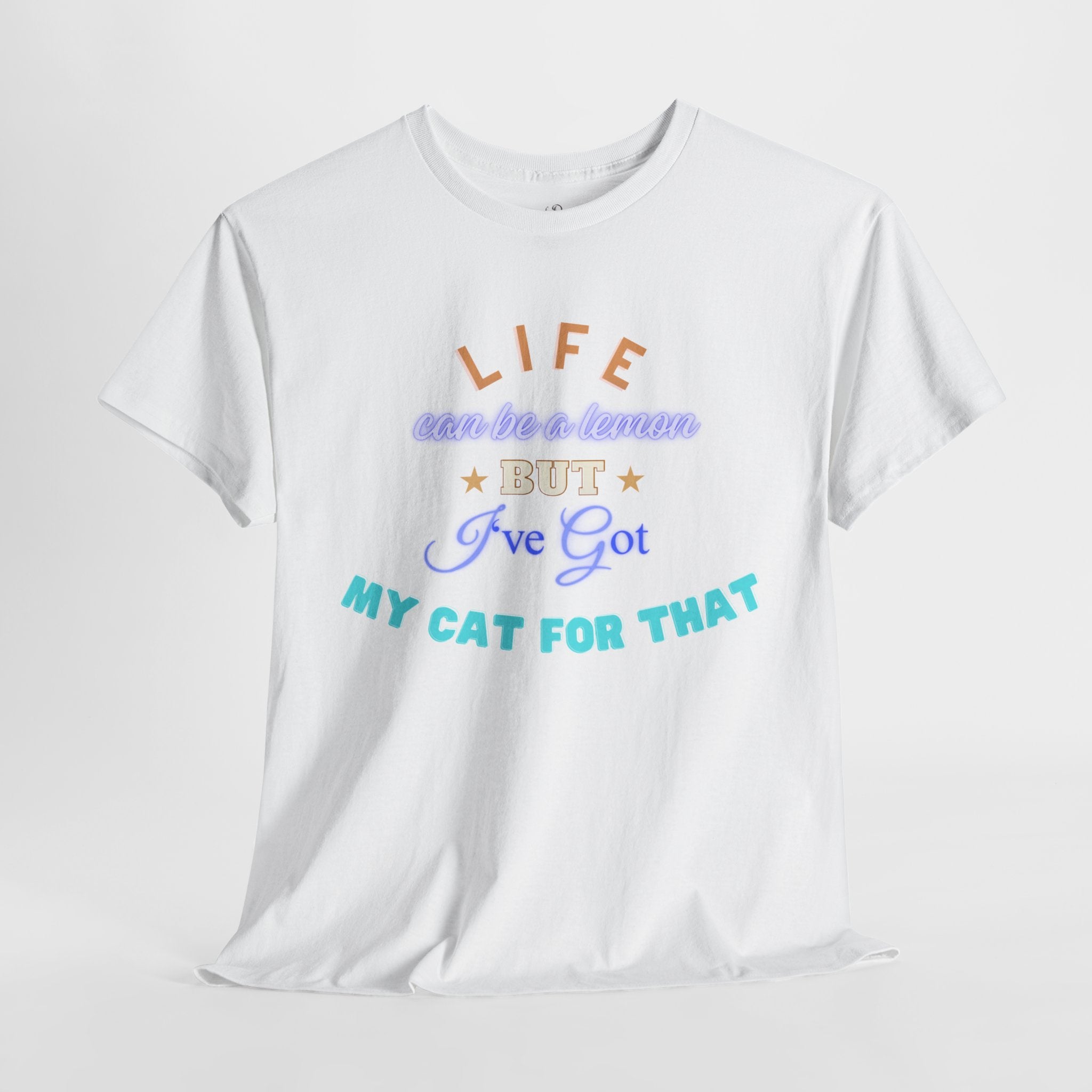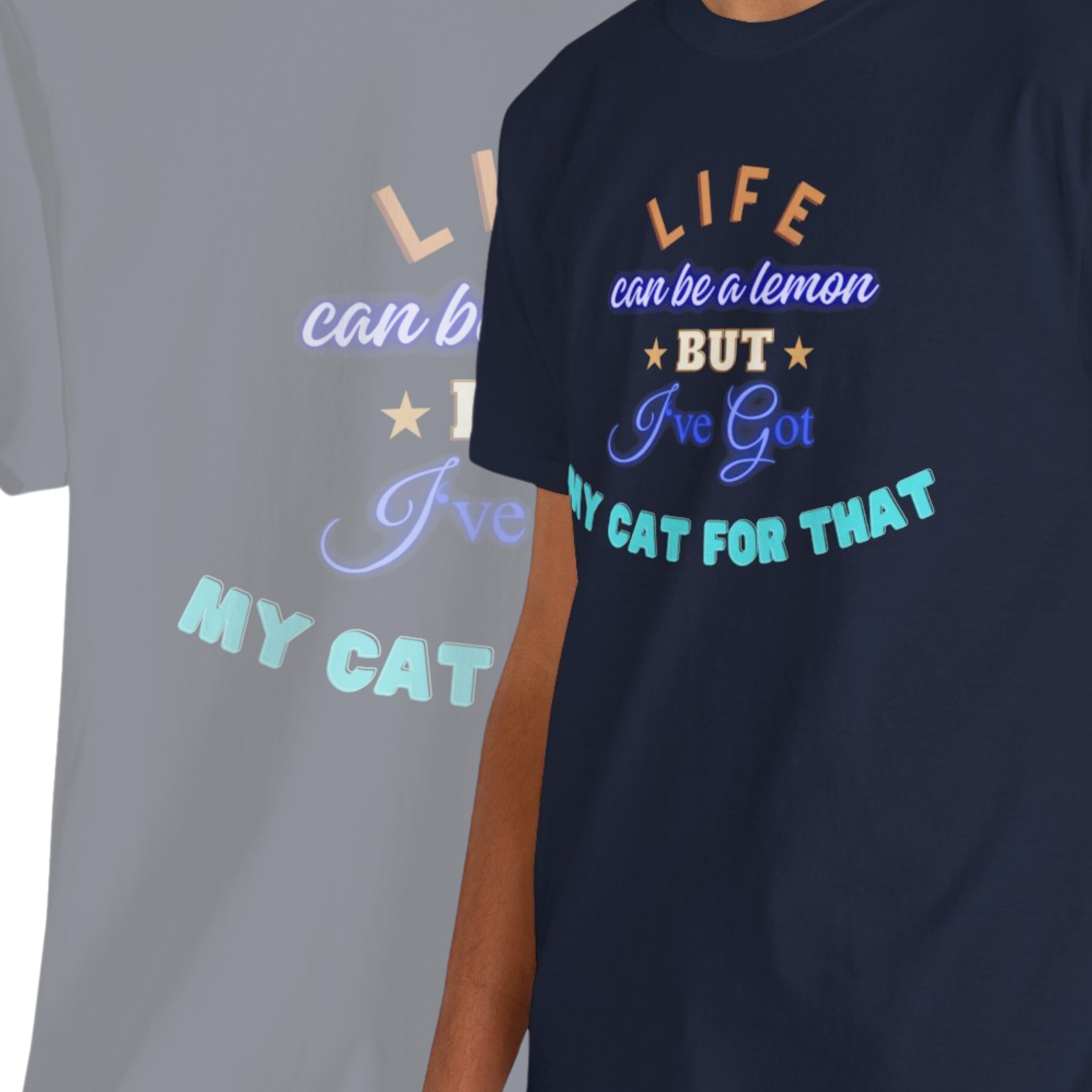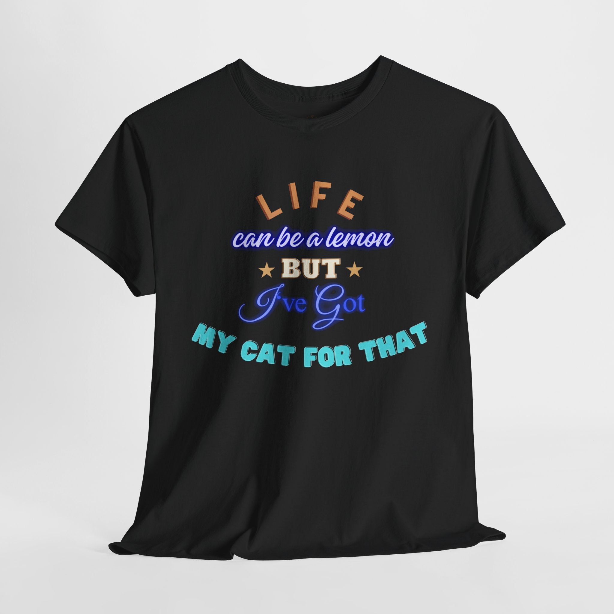 This uplifting t-shirt features the phrase "Life can be a lemon, but I've got my cat for that," reminding us of the positive impact that our feline companions have on our lives. The design celebrates the unconditional love and companionship that cats offer, and the way they can brighten even the toughest days.
