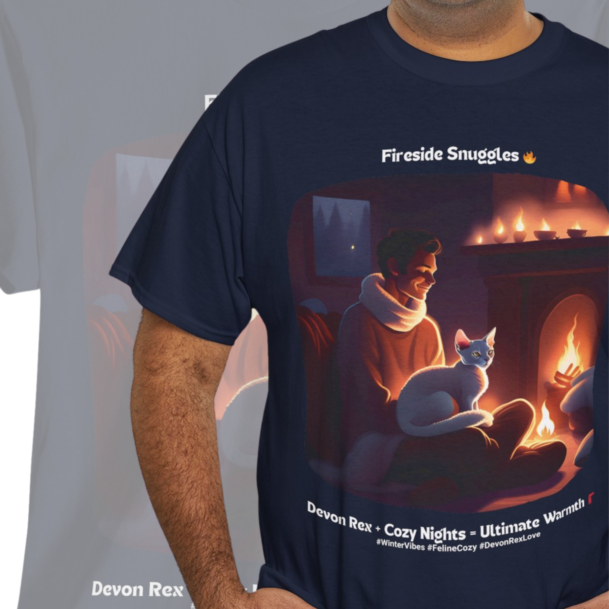Men’s “Fireside Snuggles with Devon Rex” T‑Shirt – Cozy Cat Dad Gift