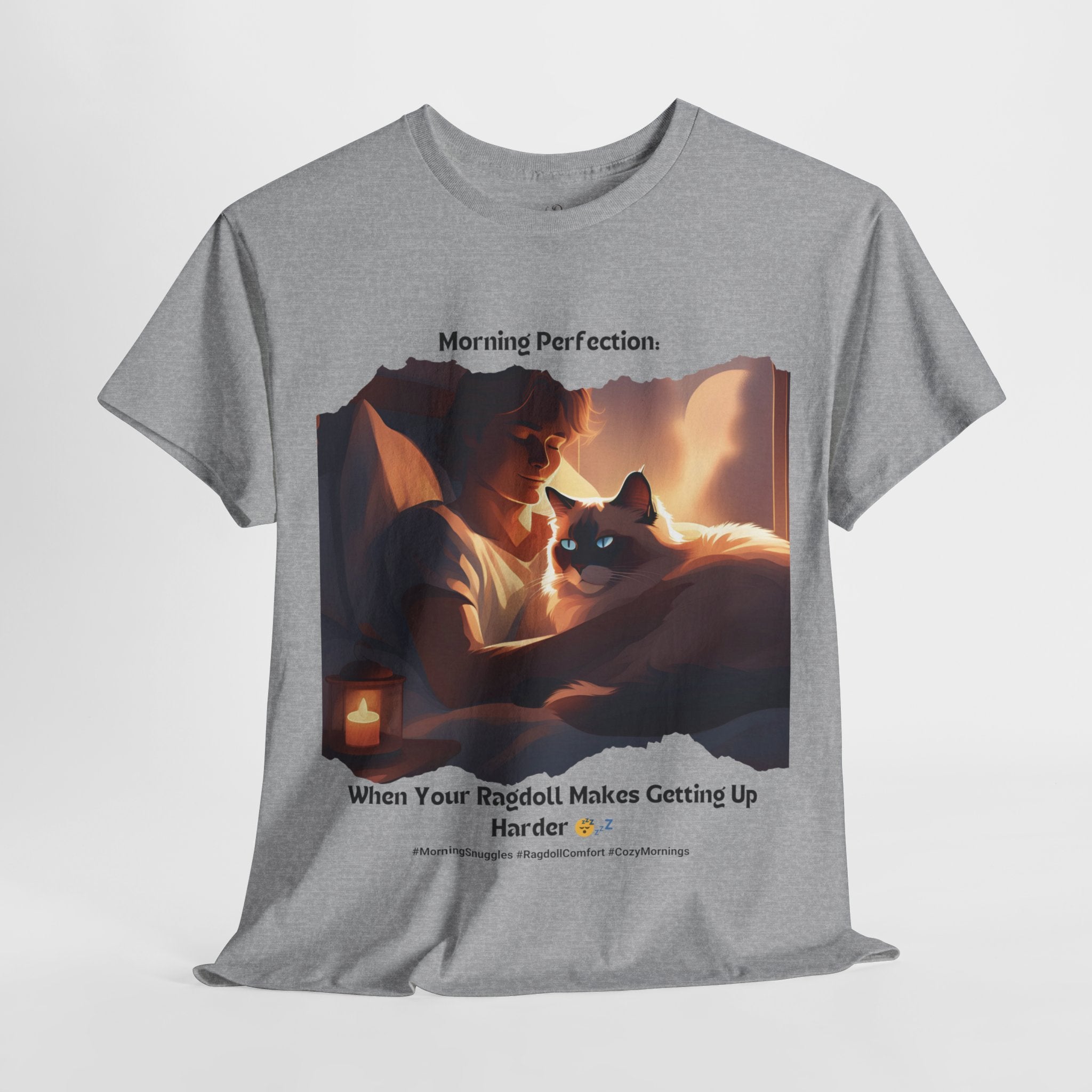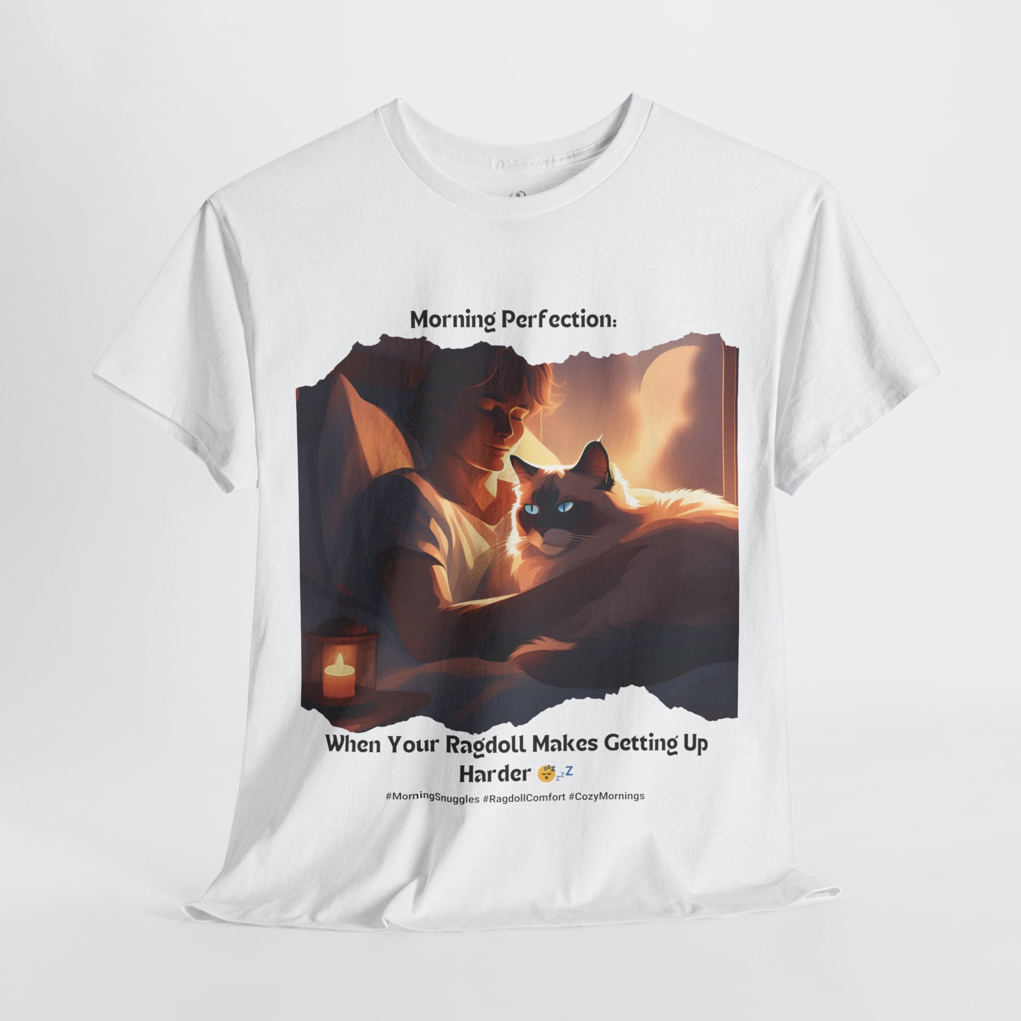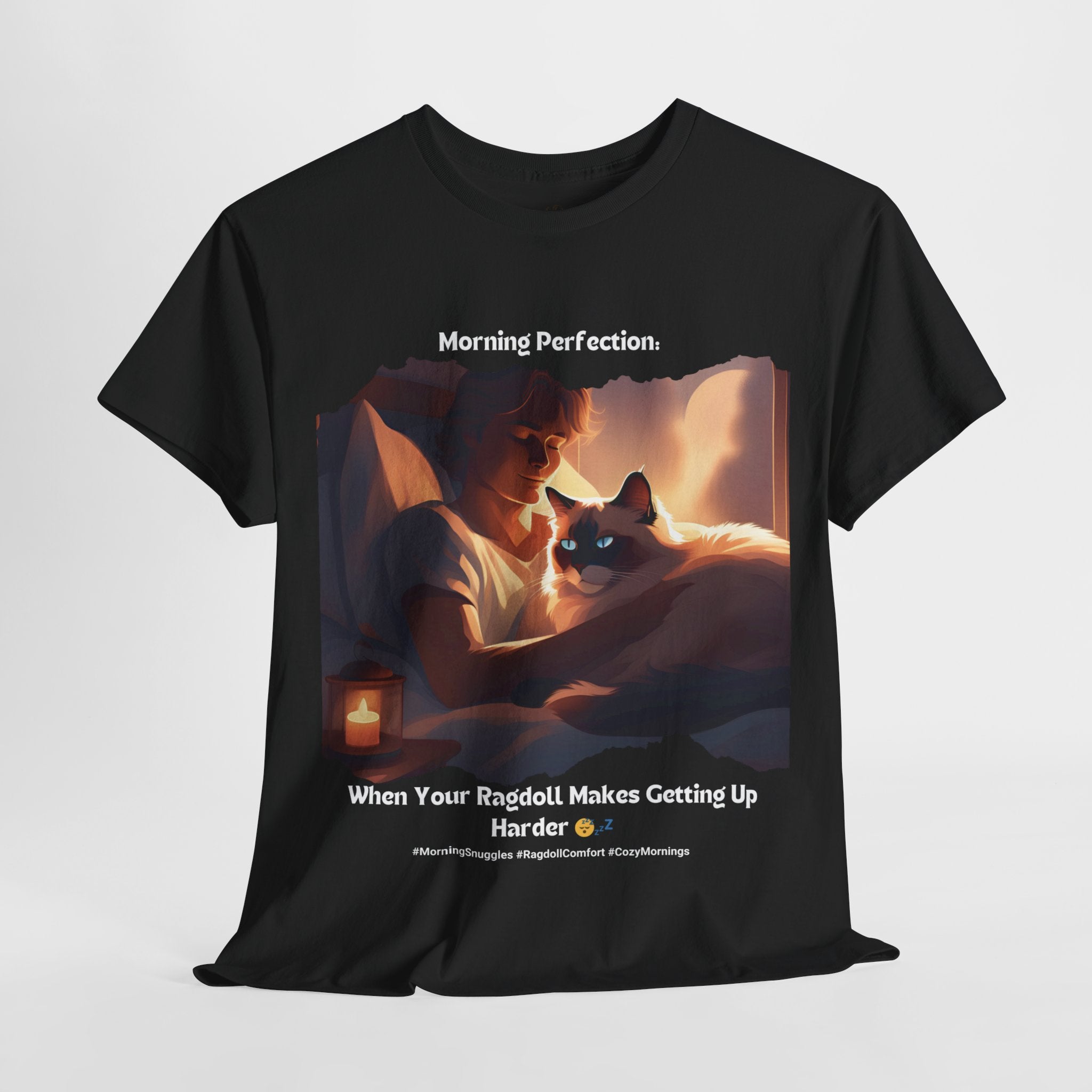 Start your day off right with a dose of pure bliss. Our Ragdoll t-shirt features a heartwarming image of a human cuddling with the adorable Ragdoll cat in bed. This design perfectly captures the irresistible urge to stay snuggled up and enjoy the morning's peaceful atmosphere.