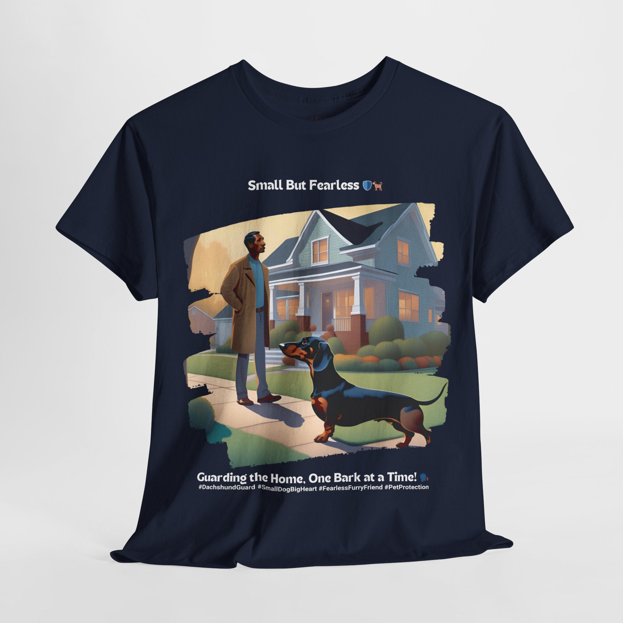 Are you a proud Dachshund owner who loves your dog's unwavering loyalty and protective instincts? This t-shirt is a must-have for any dog parent who appreciates the incredible bravery and courage of their wiener dog. Our design captures the heartwarming moment of a Dachshund standing guard by their human's side, ready to defend their home with all their might.
