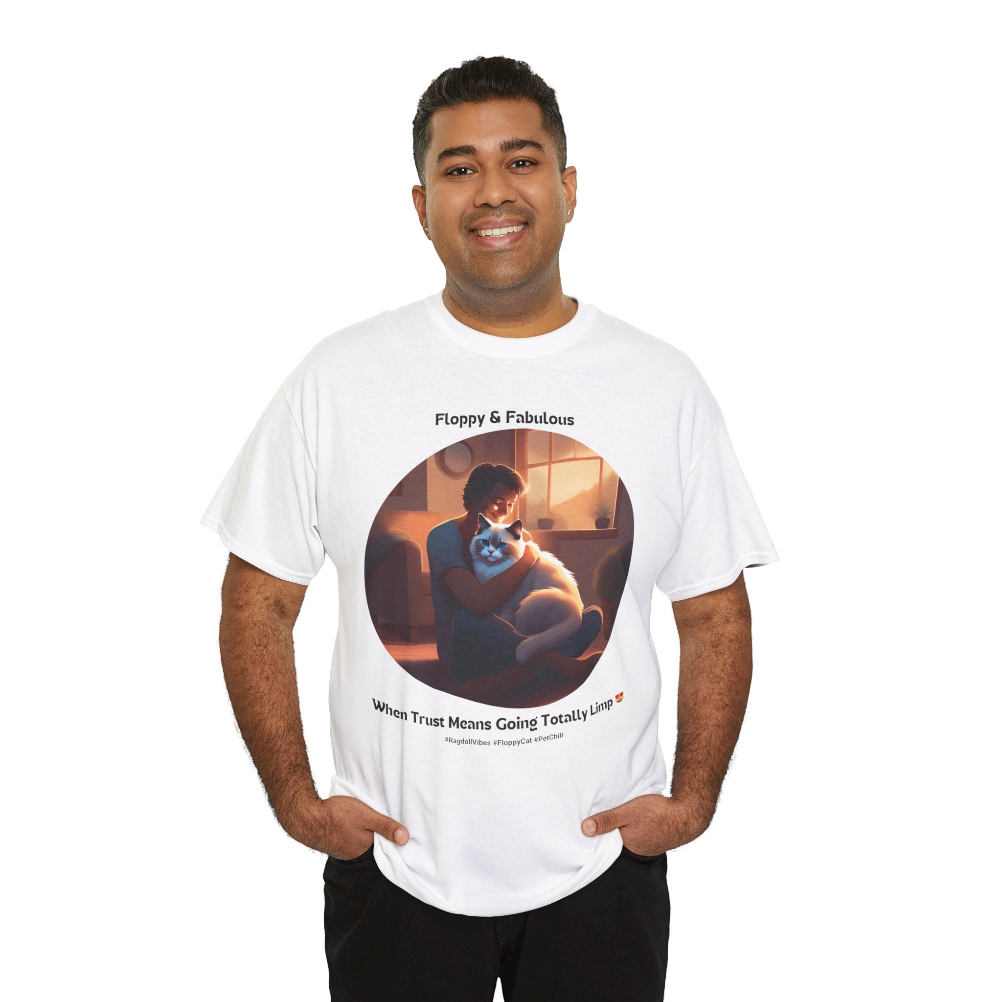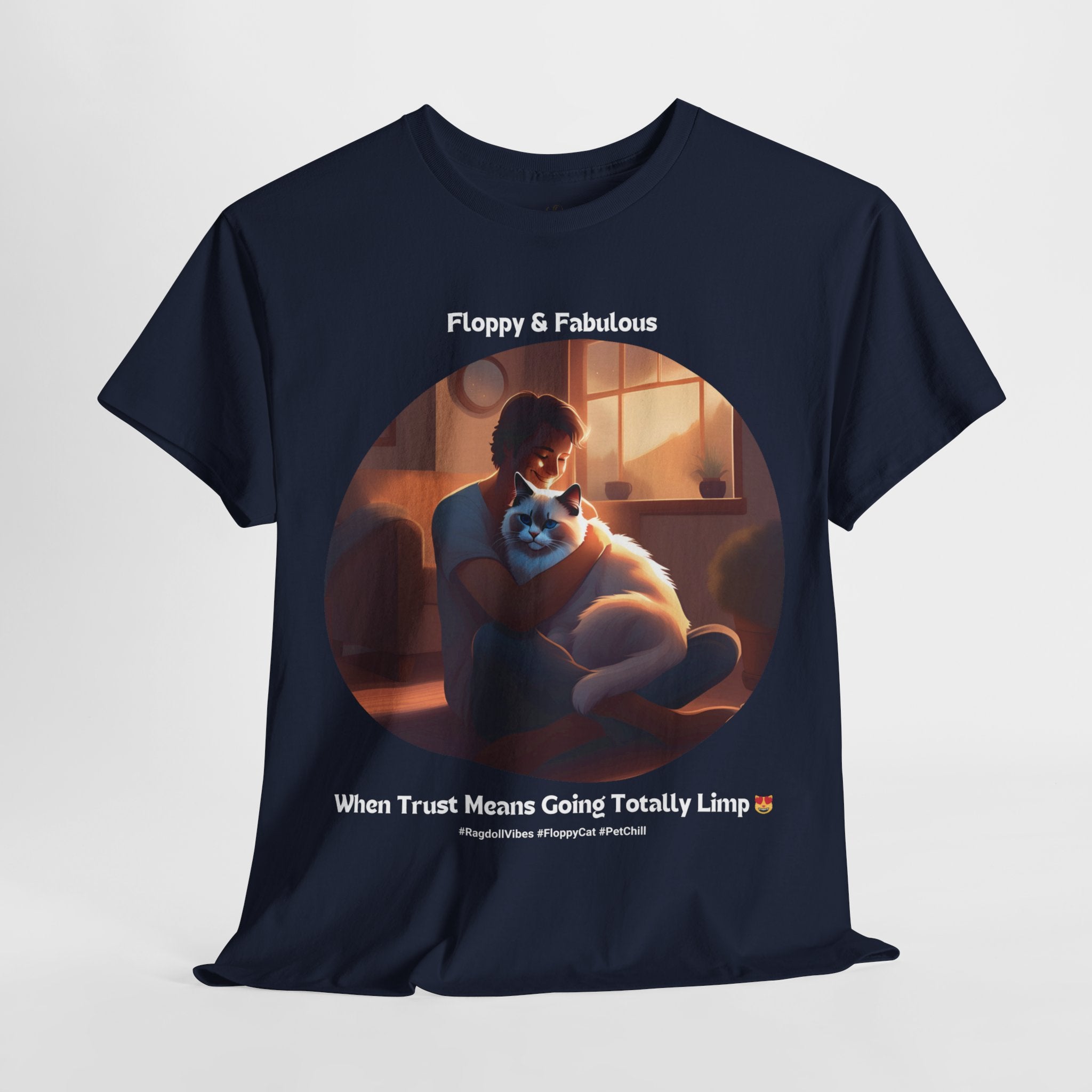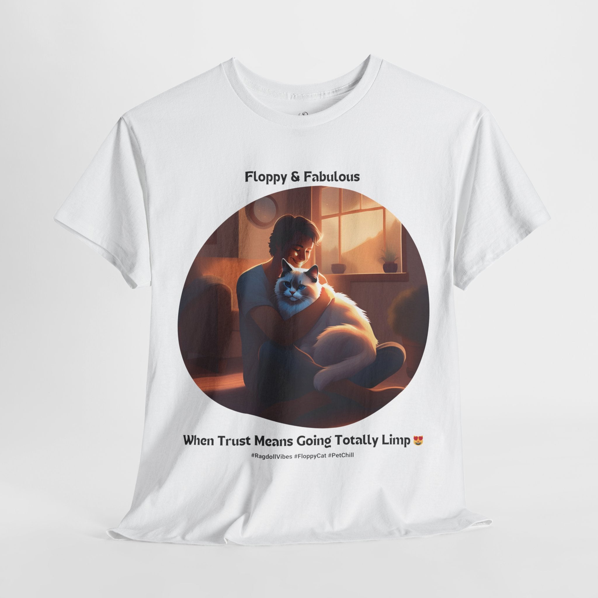 Experience the ultimate in feline relaxation with our Ragdoll t-shirt. This design features a heartwarming image of a human cuddling with a Ragdoll cat, capturing the trust and comfort that these incredible pets bring to our lives.