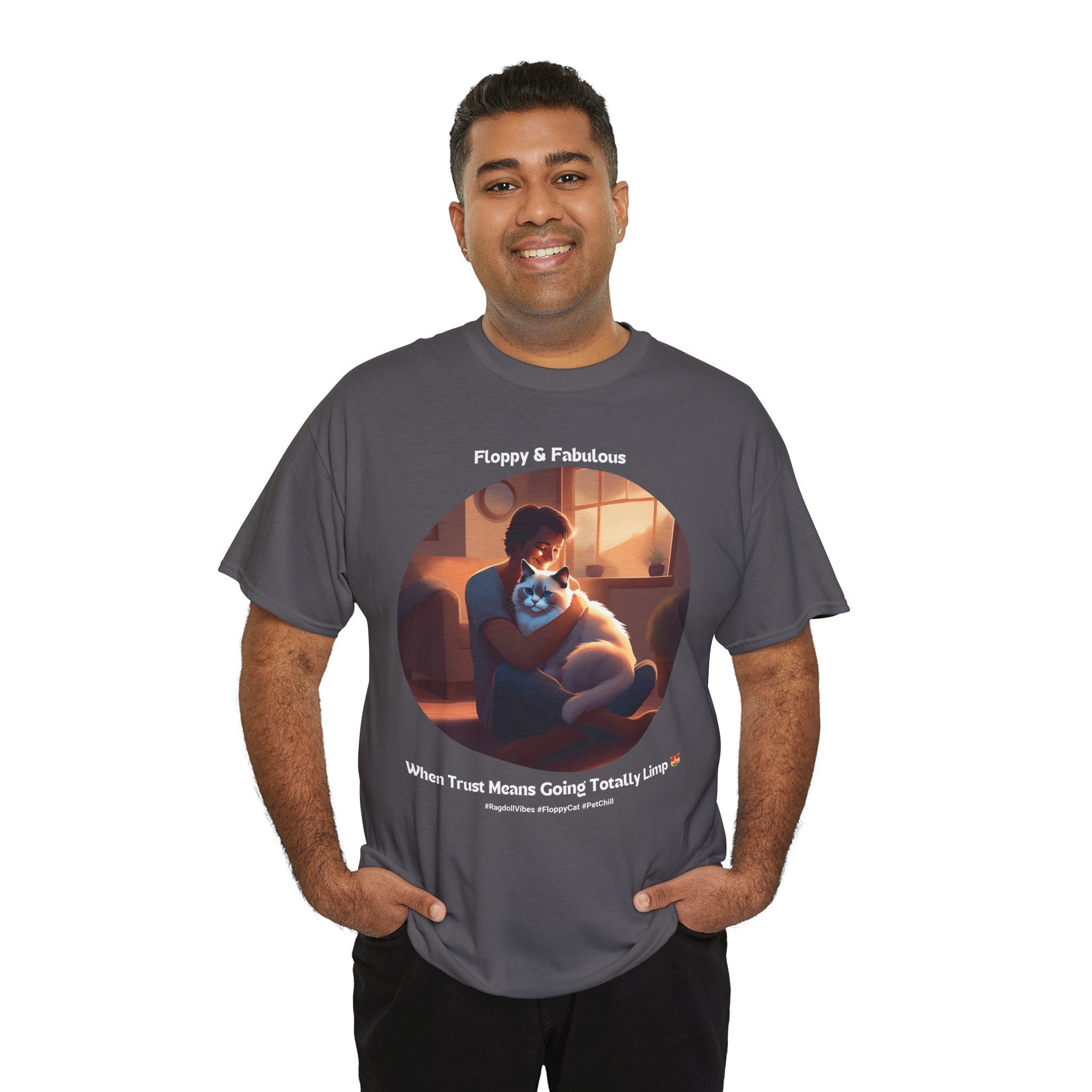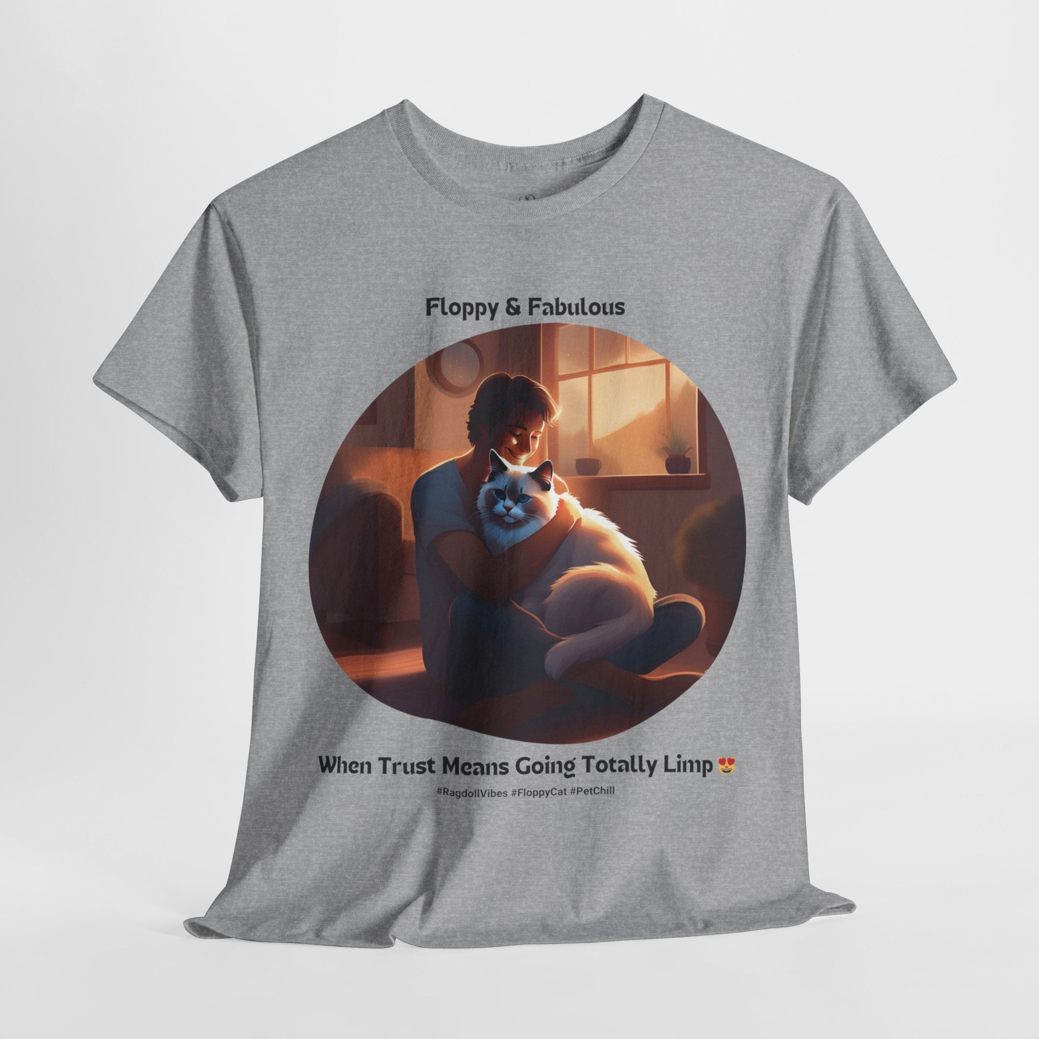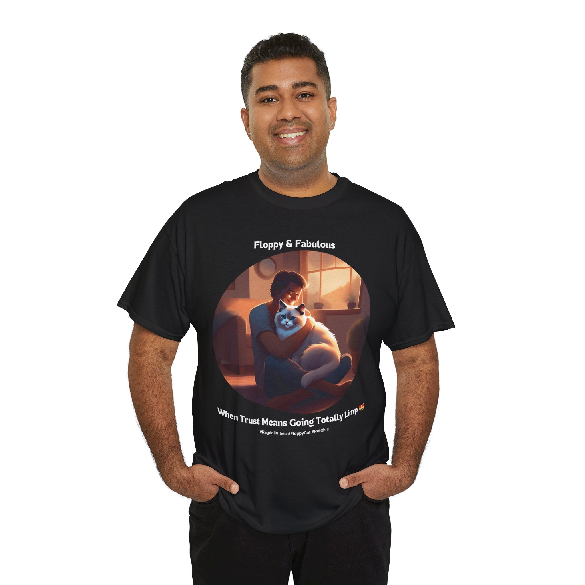 Experience the ultimate in feline relaxation with our Ragdoll t-shirt. This design features a heartwarming image of a human cuddling with a Ragdoll cat, capturing the trust and comfort that these incredible pets bring to our lives.