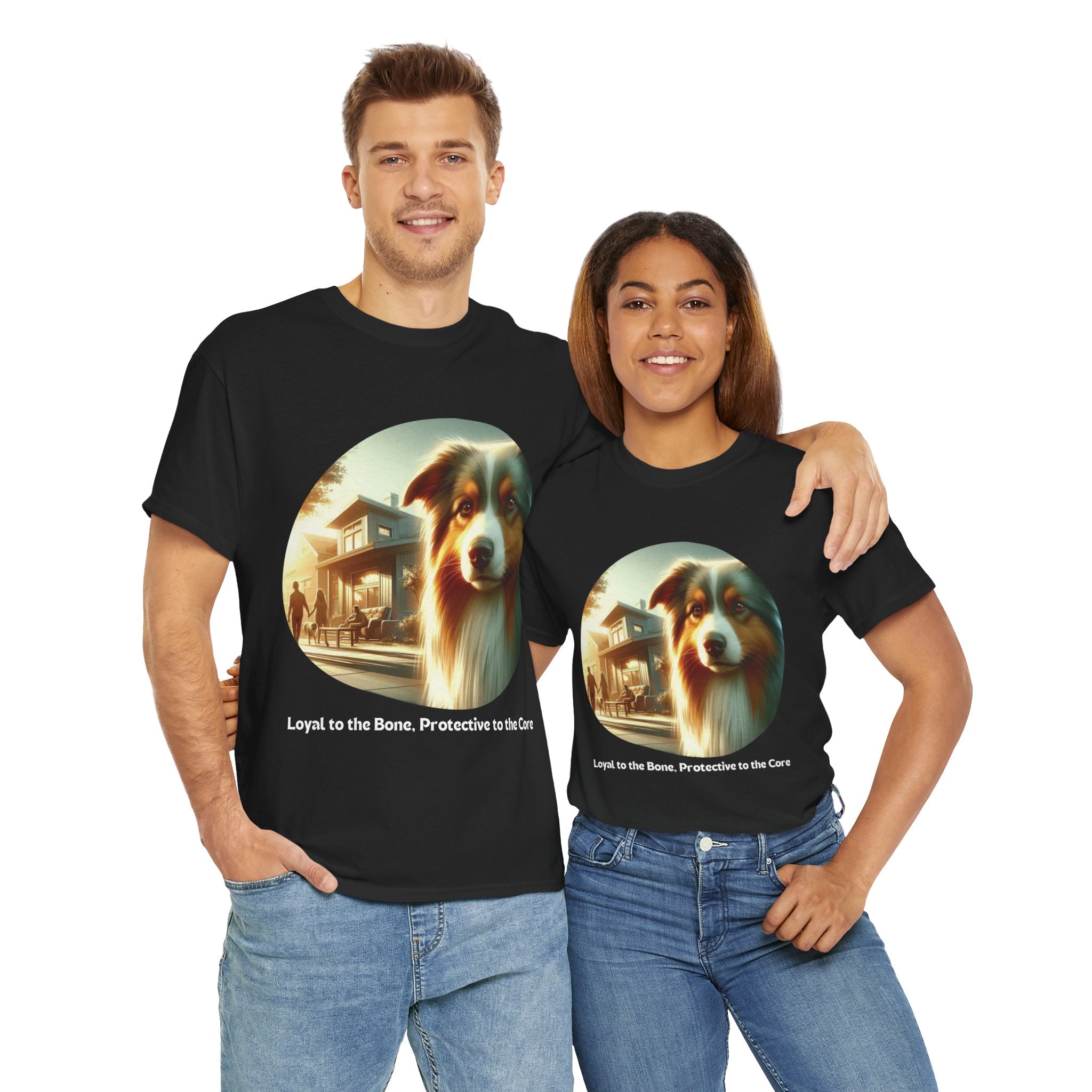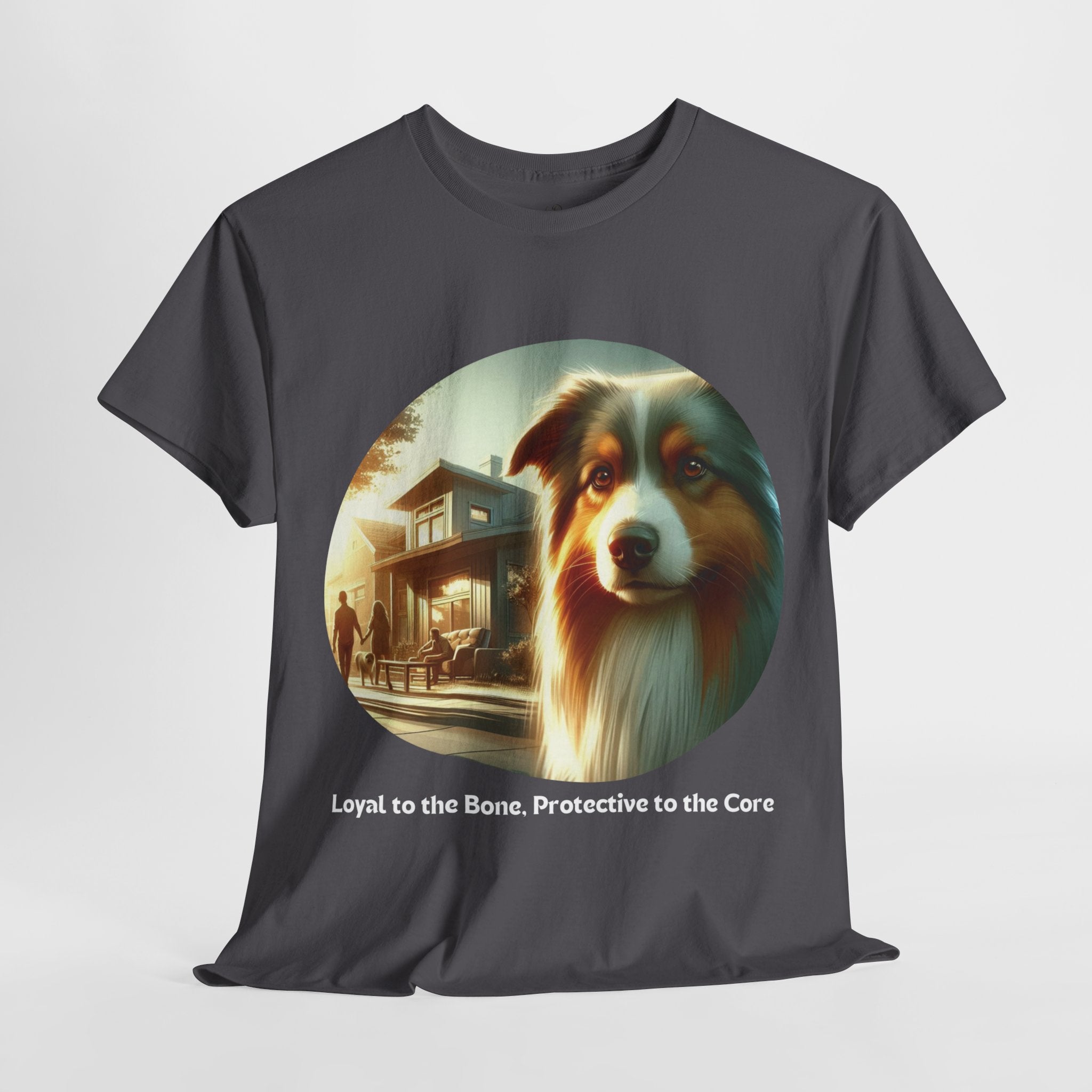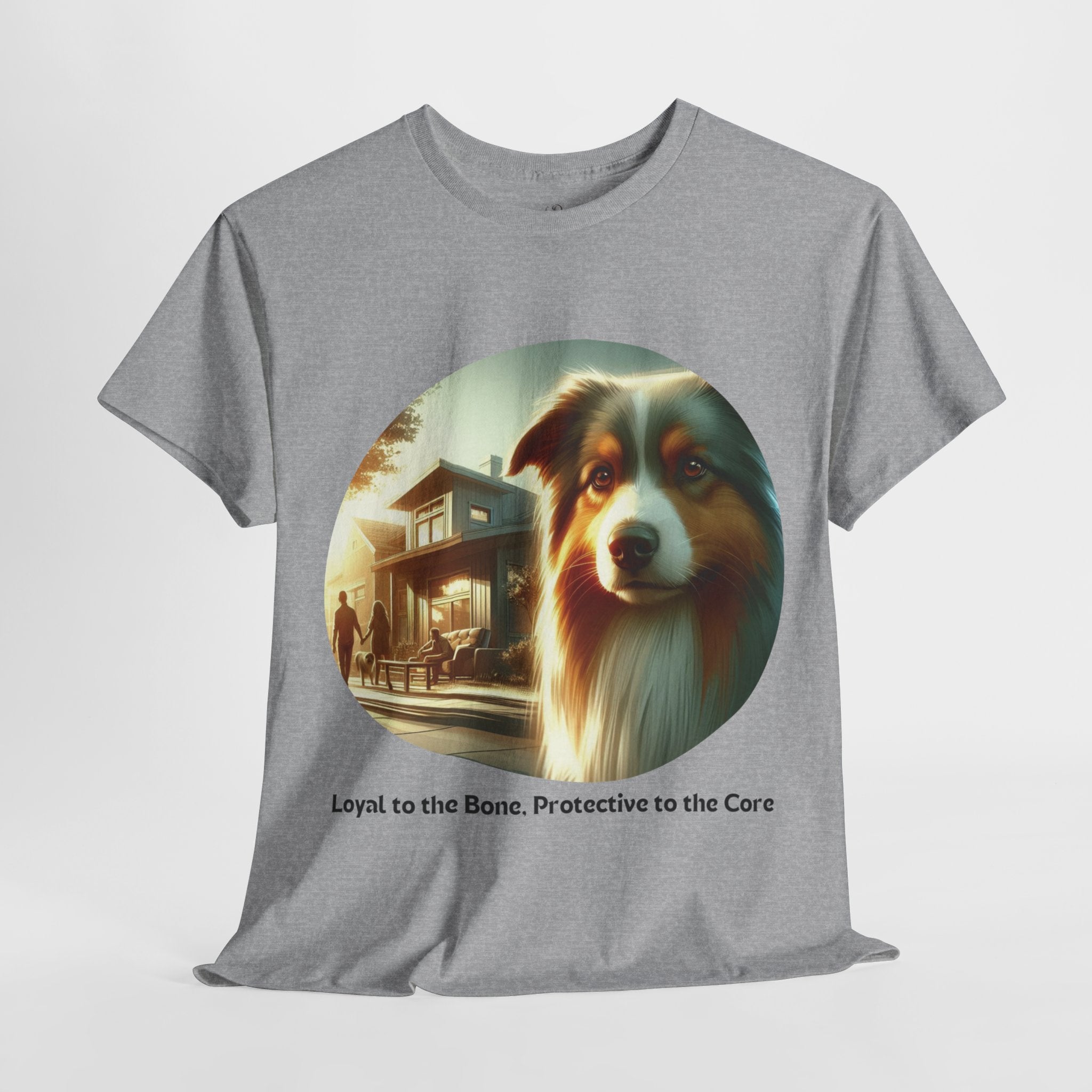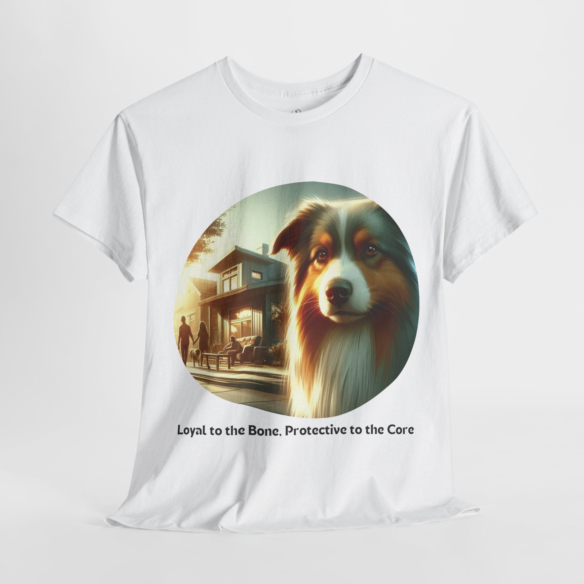 Celebrate the unwavering loyalty and protective nature of Australian Shepherds with this heartfelt t-shirt. Our design features a majestic Aussie standing guard over a family home, symbolizing their dedication and devotion. Aussies are known for their strong bond with their human companions and their instinctual desire to protect those they love.