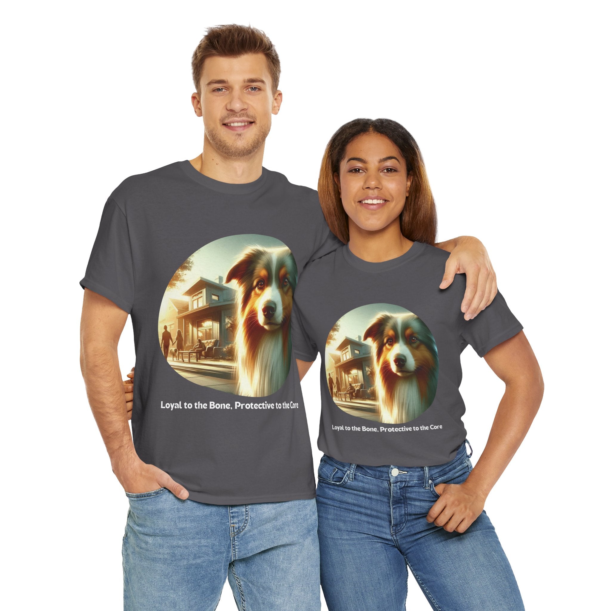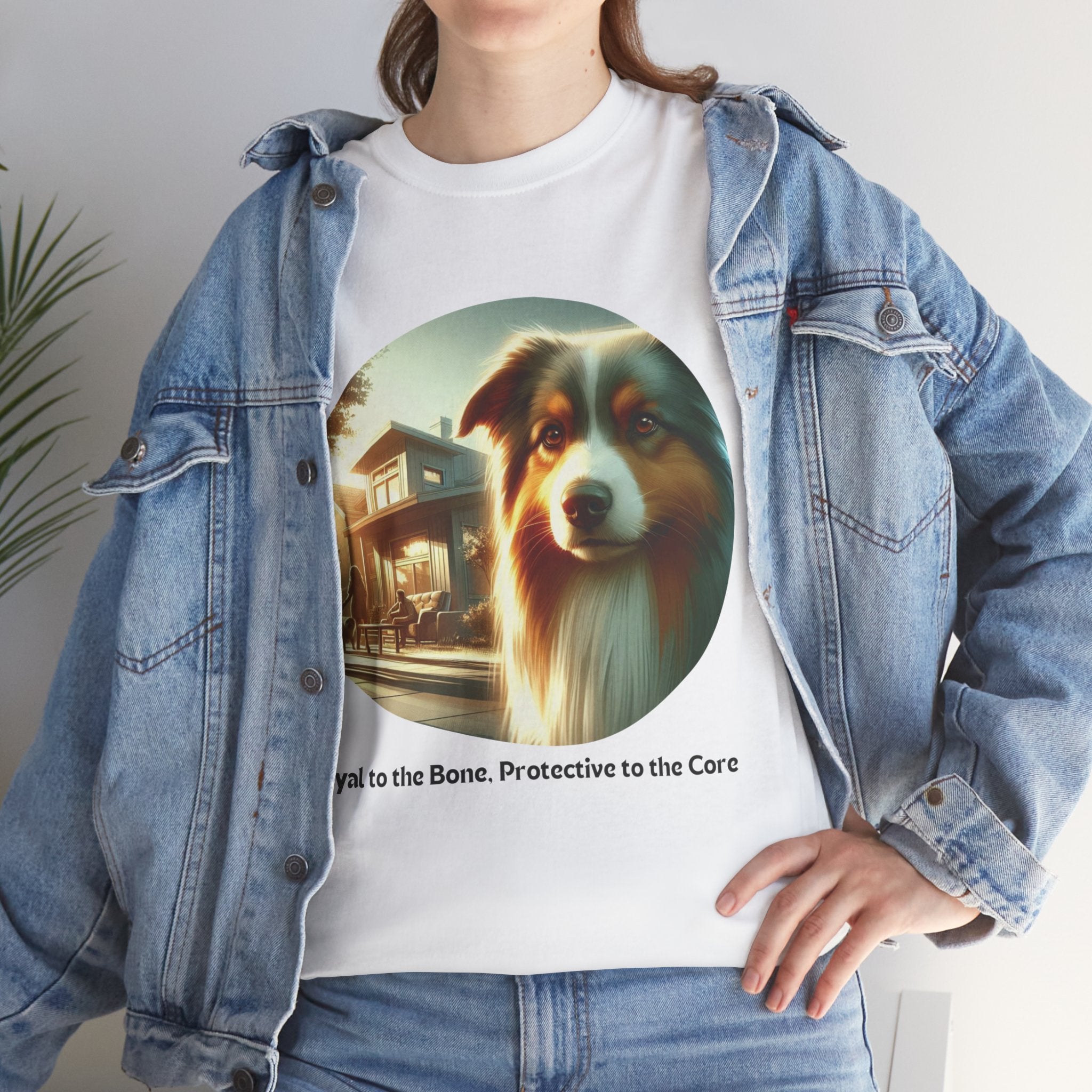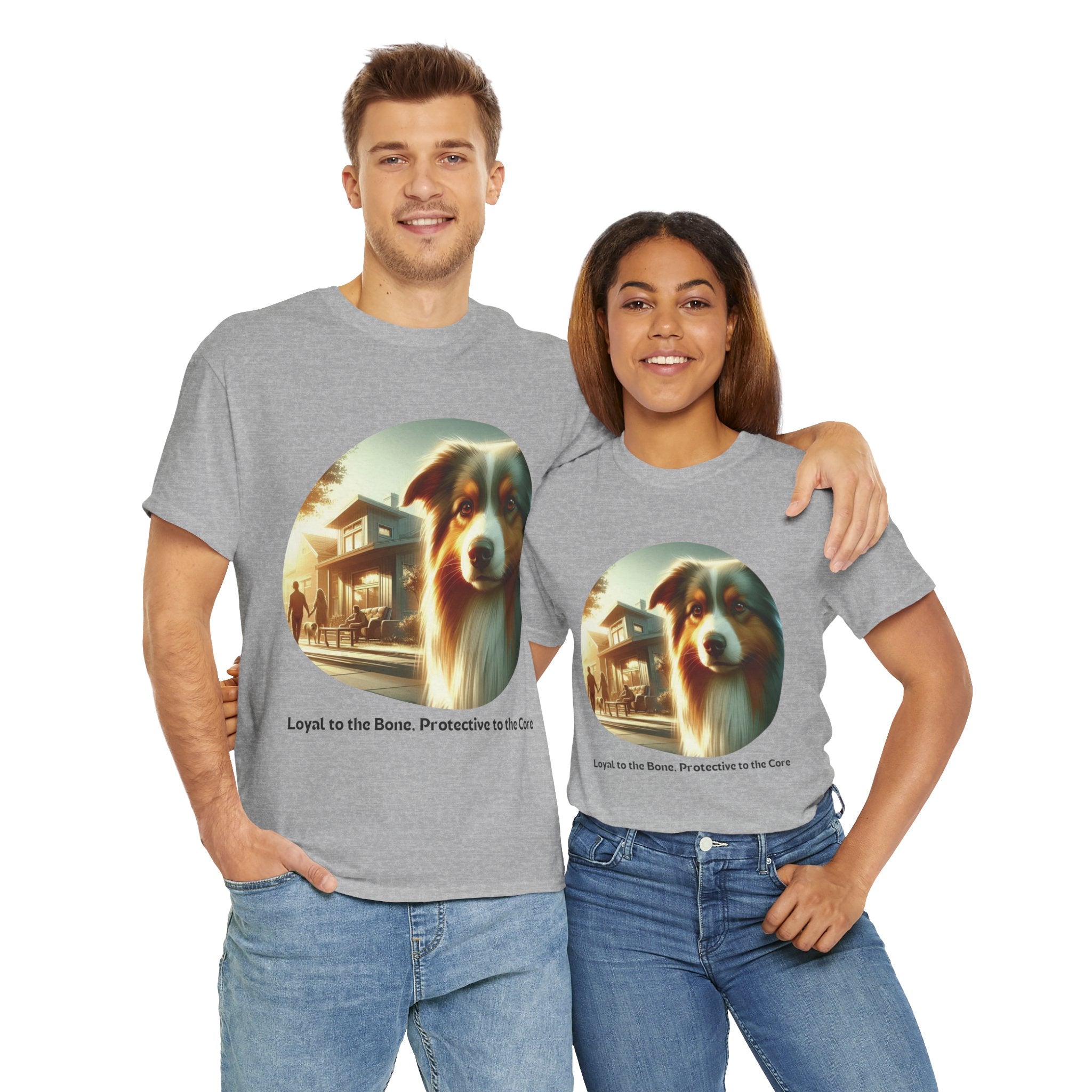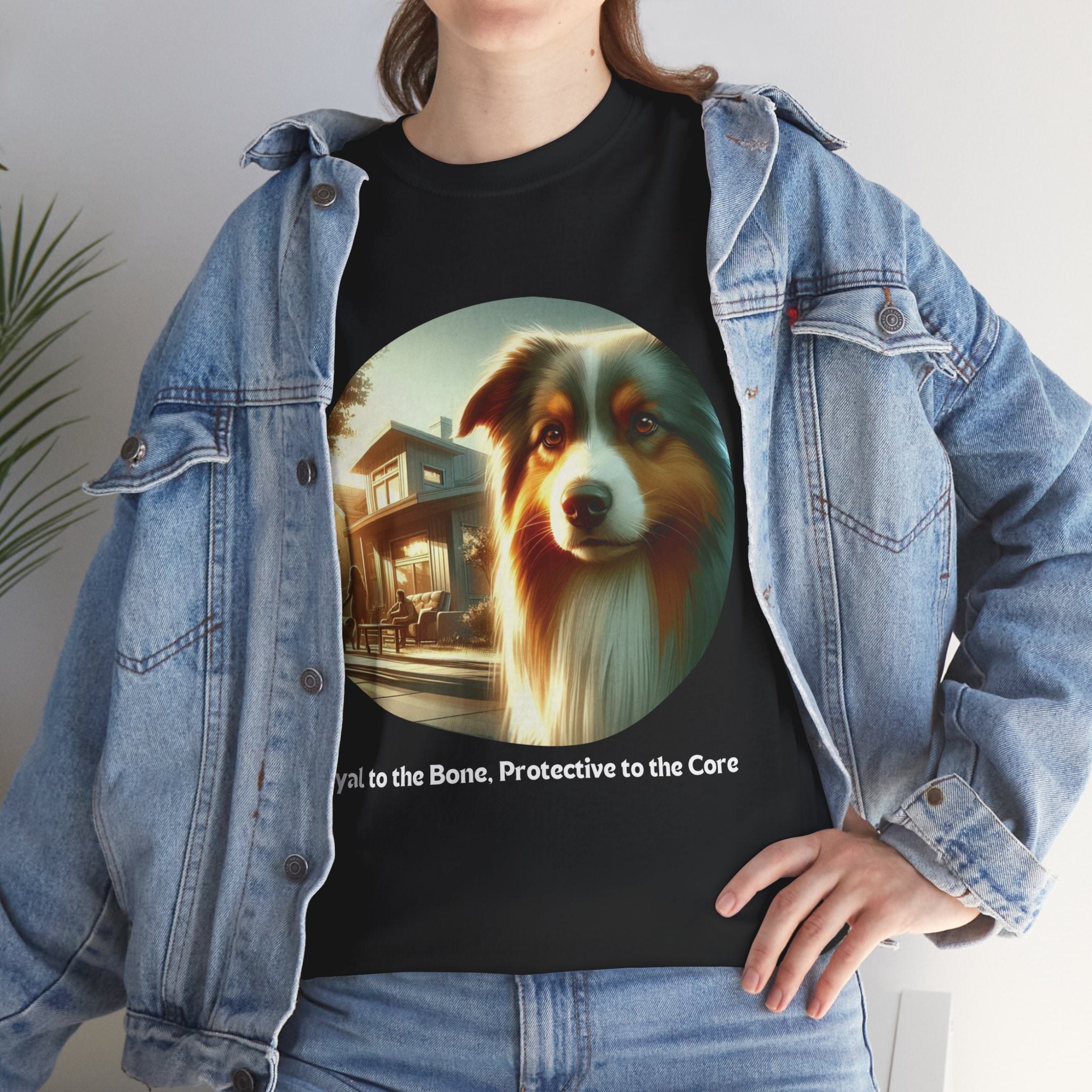 Celebrate the unwavering loyalty and protective nature of Australian Shepherds with this heartfelt t-shirt. Our design features a majestic Aussie standing guard over a family home, symbolizing their dedication and devotion. Aussies are known for their strong bond with their human companions and their instinctual desire to protect those they love.