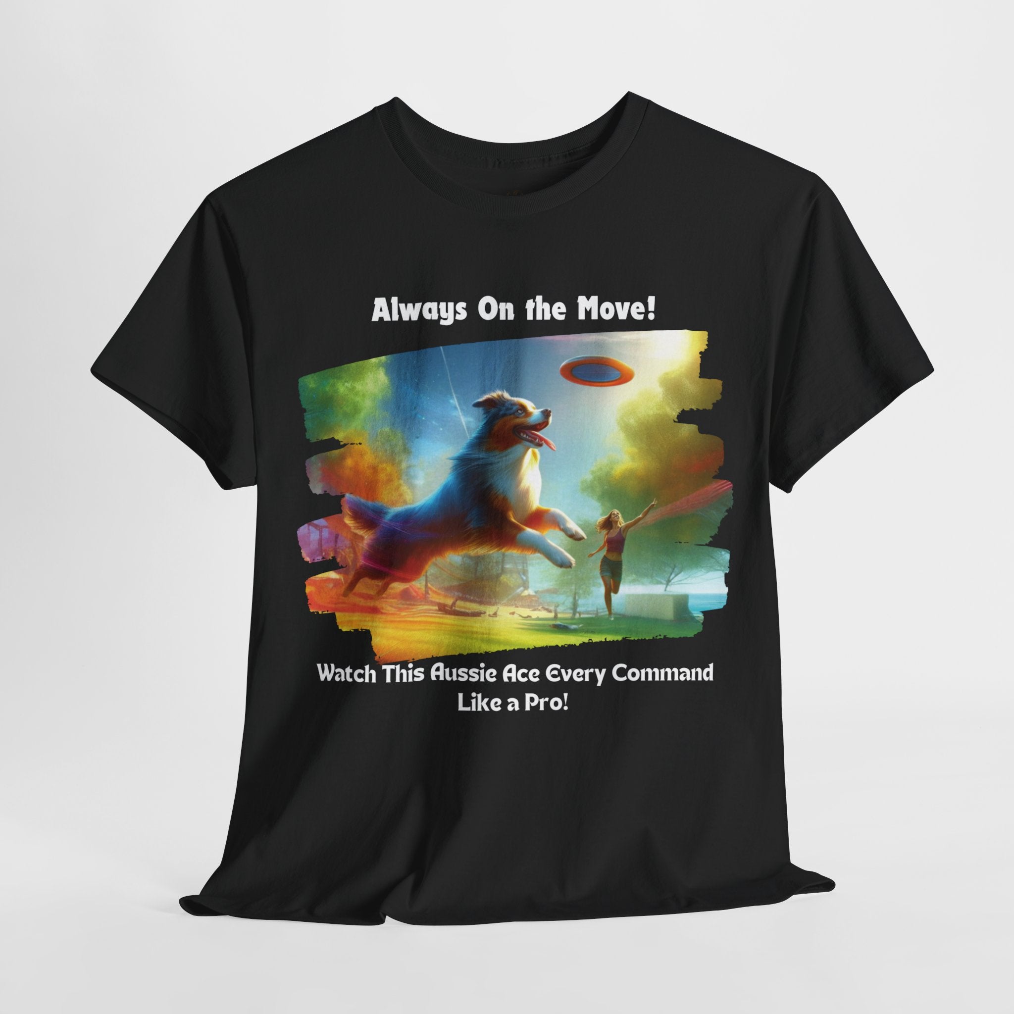 Celebrate your Australian Shepherd's athleticism and energy with this vibrant t-shirt. Our design features a dynamic image of an Aussie leaping through the air to catch a frisbee, showcasing their incredible agility and love for outdoor adventures. Aussies are known for their boundless energy and enthusiasm for physical activity, making them the perfect companions for active individuals.