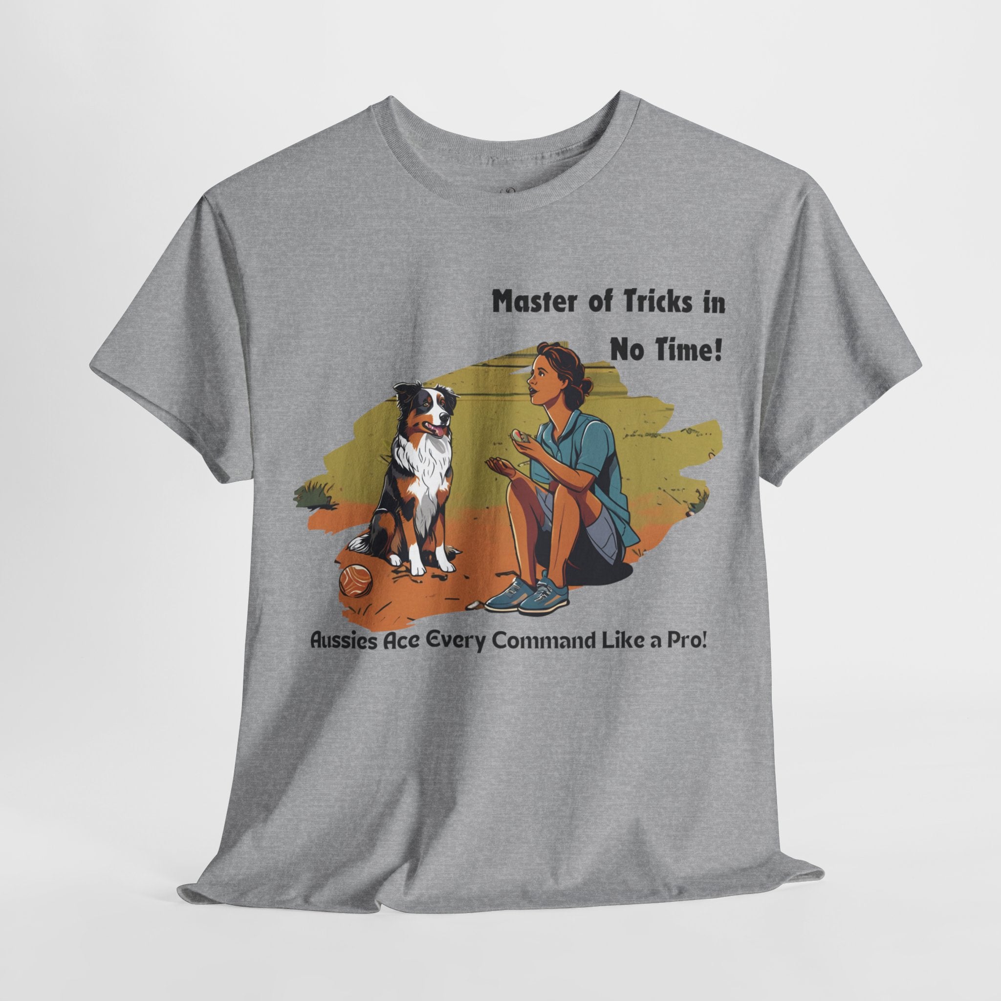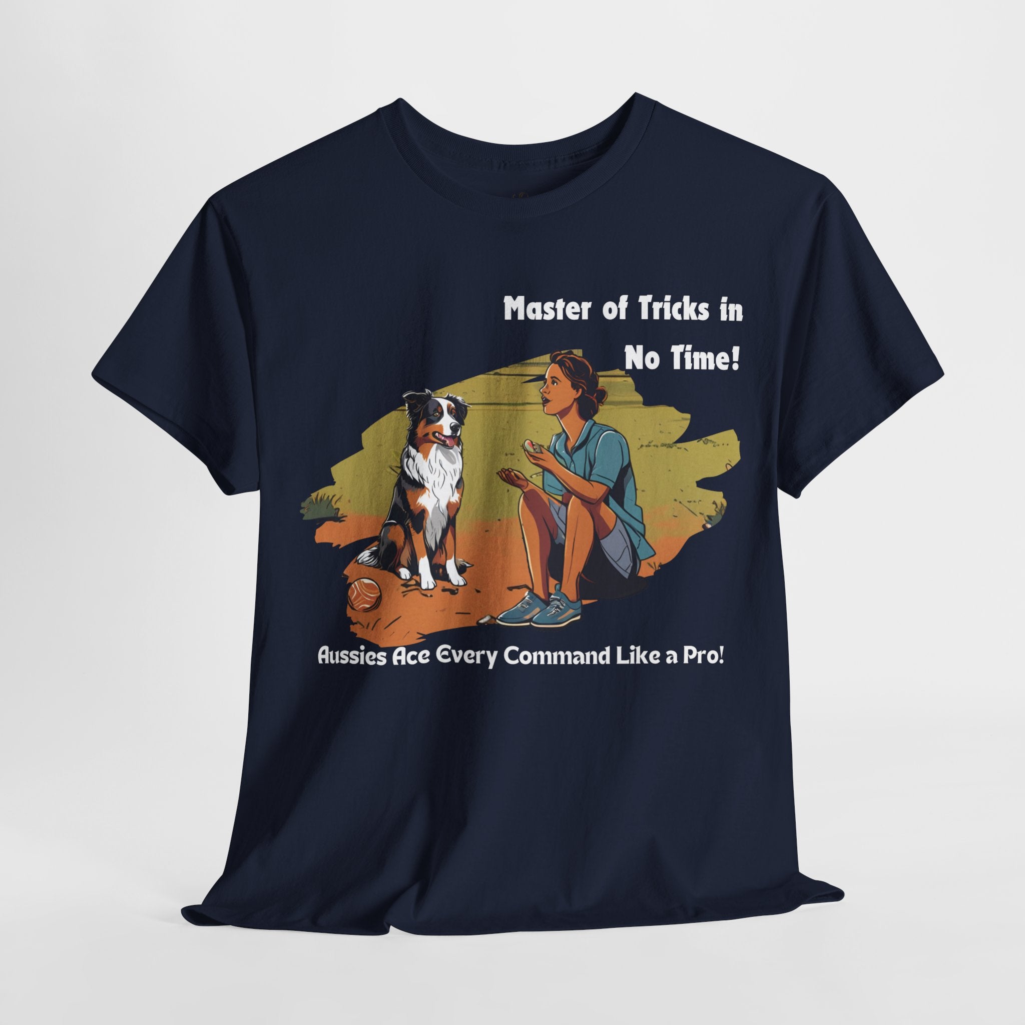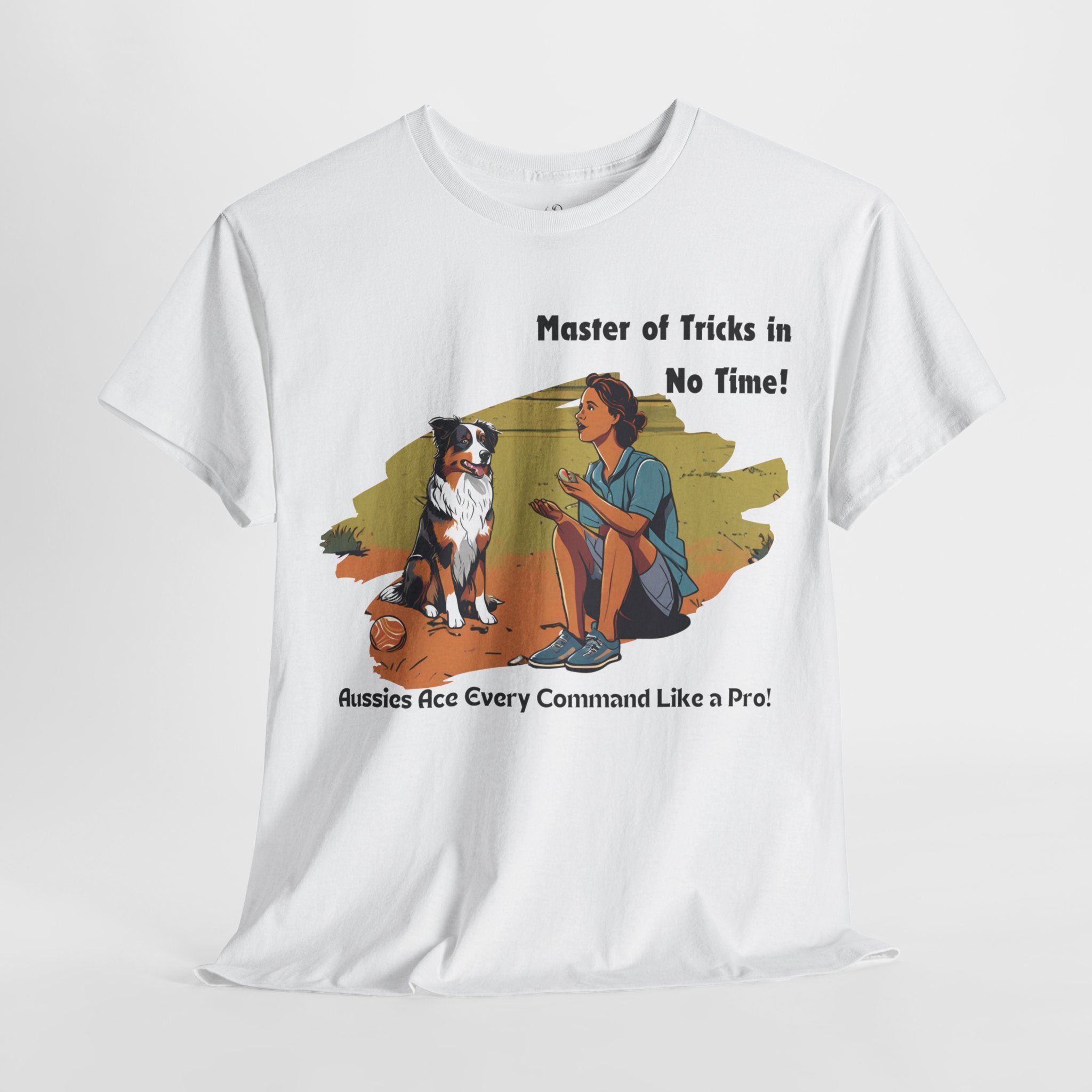 Celebrate your Australian Shepherd's intelligence and trainability with this fun and informative t-shirt. Our design features a human teaching an Aussie new tricks, showcasing their natural aptitude for learning. Aussies are known for their quick wit and eagerness to please, making them the perfect companions for dog training enthusiasts.