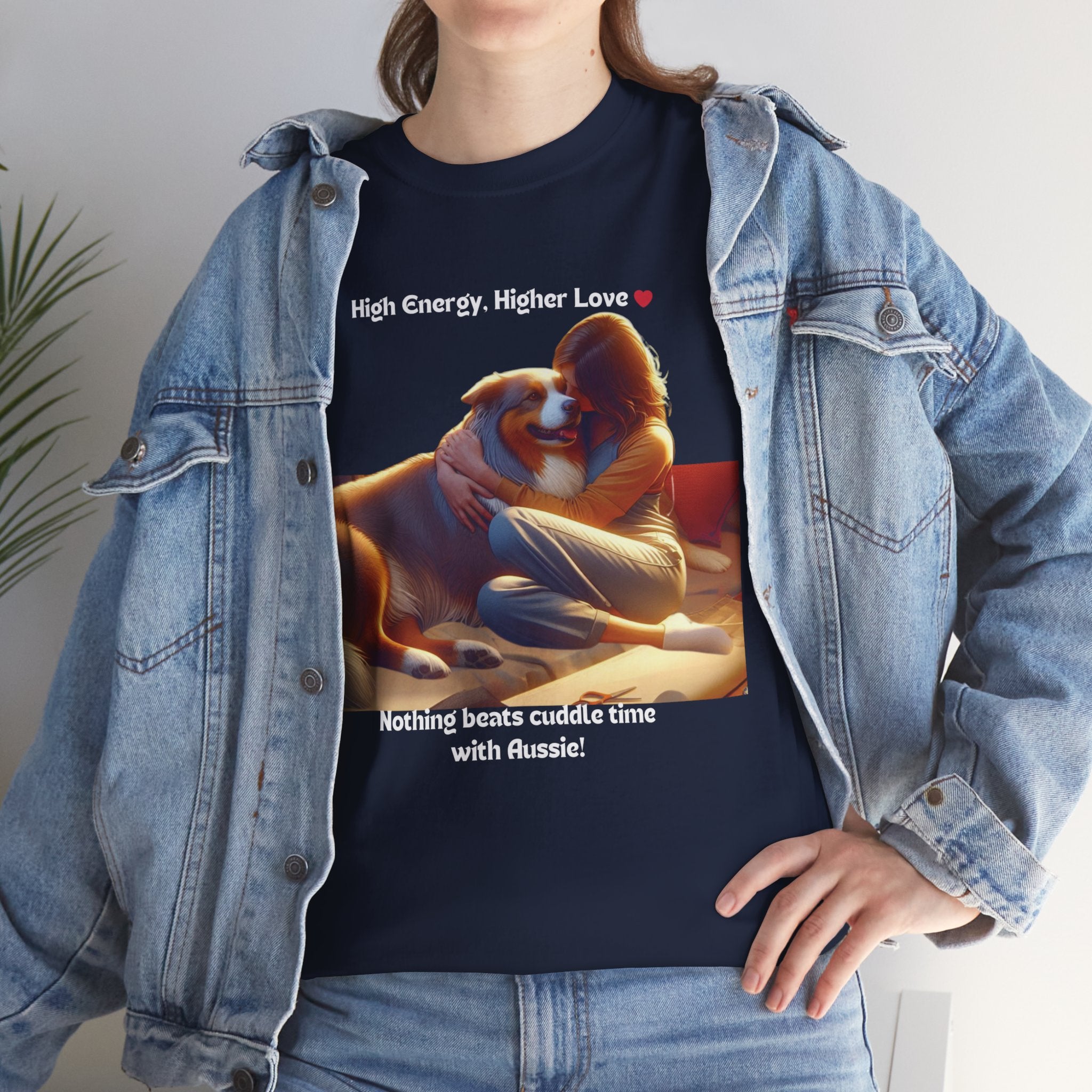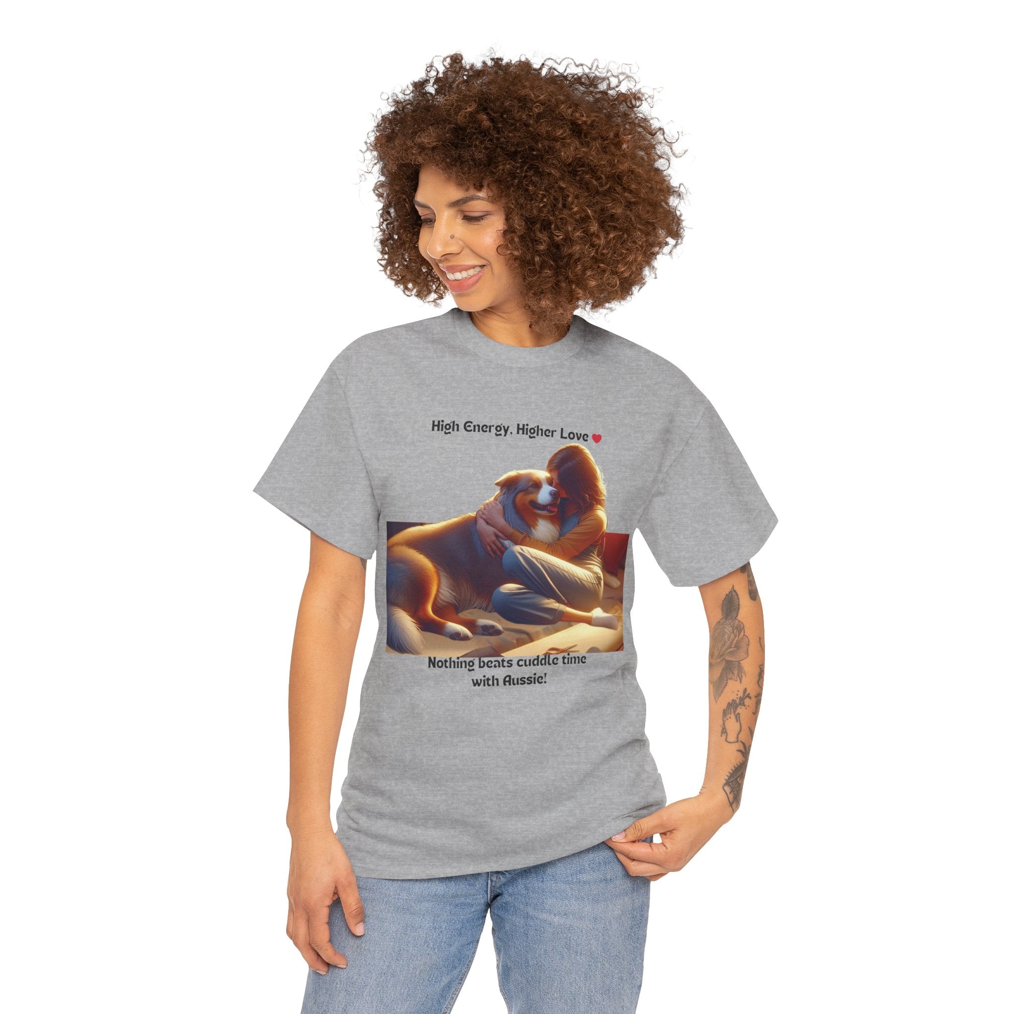 Celebrate the boundless energy and unconditional love of Australian Shepherds with this heartwarming t-shirt. Our design features a human cuddling with an Aussie, capturing the essence of their special bond. Aussies are known for their playful personalities and their ability to fill your life with joy and laughter.