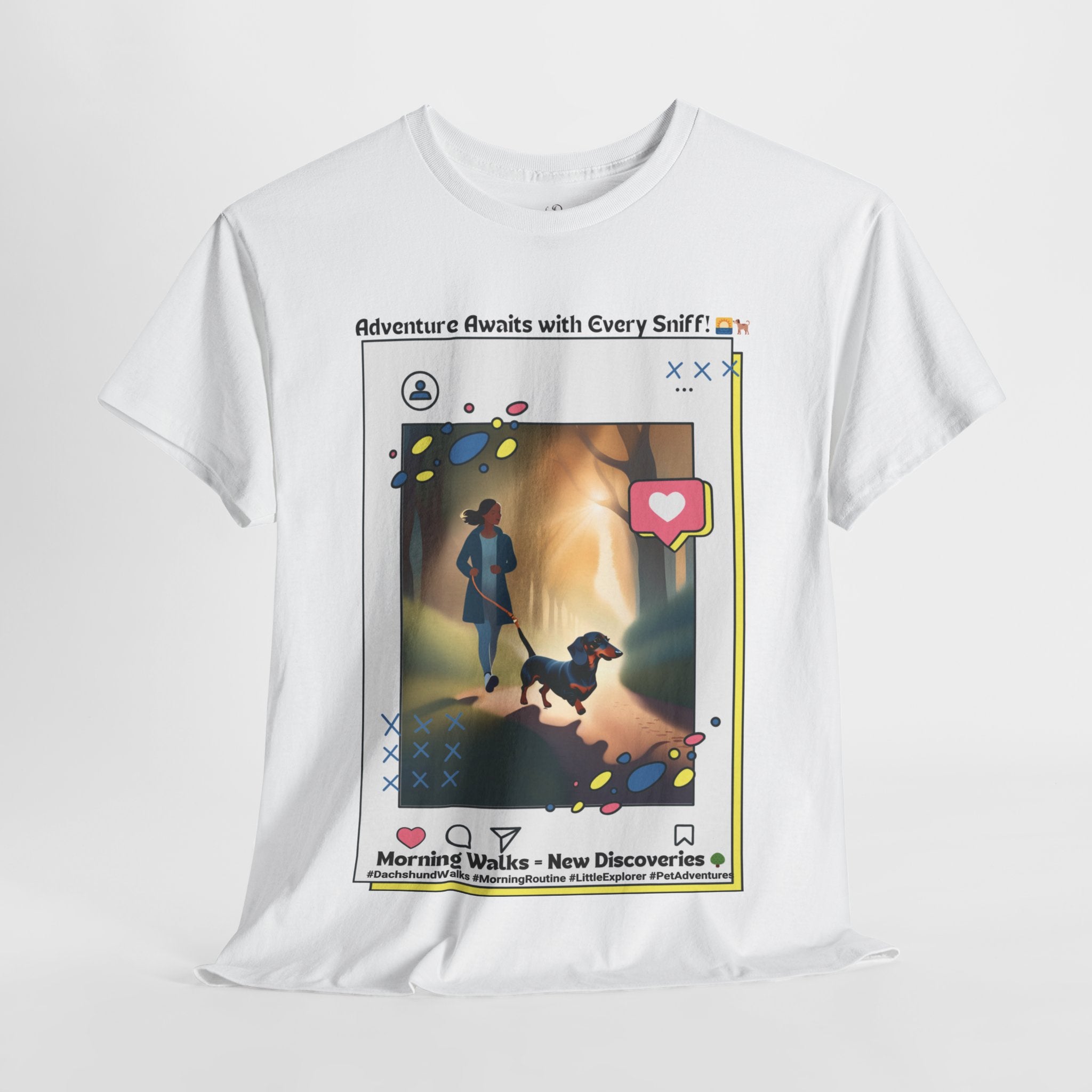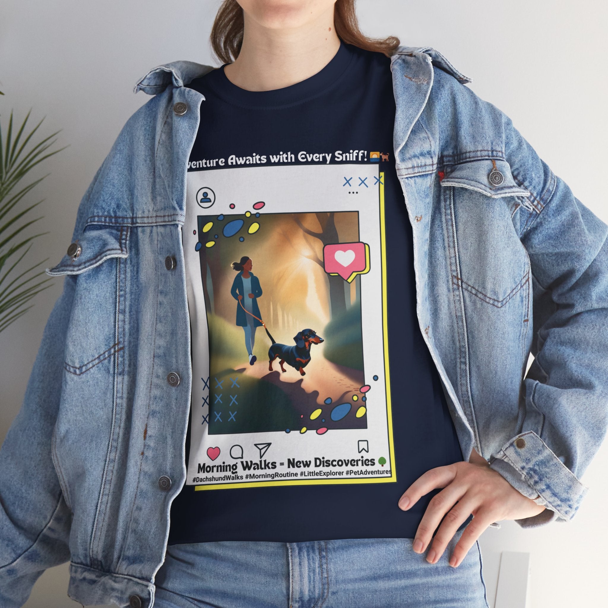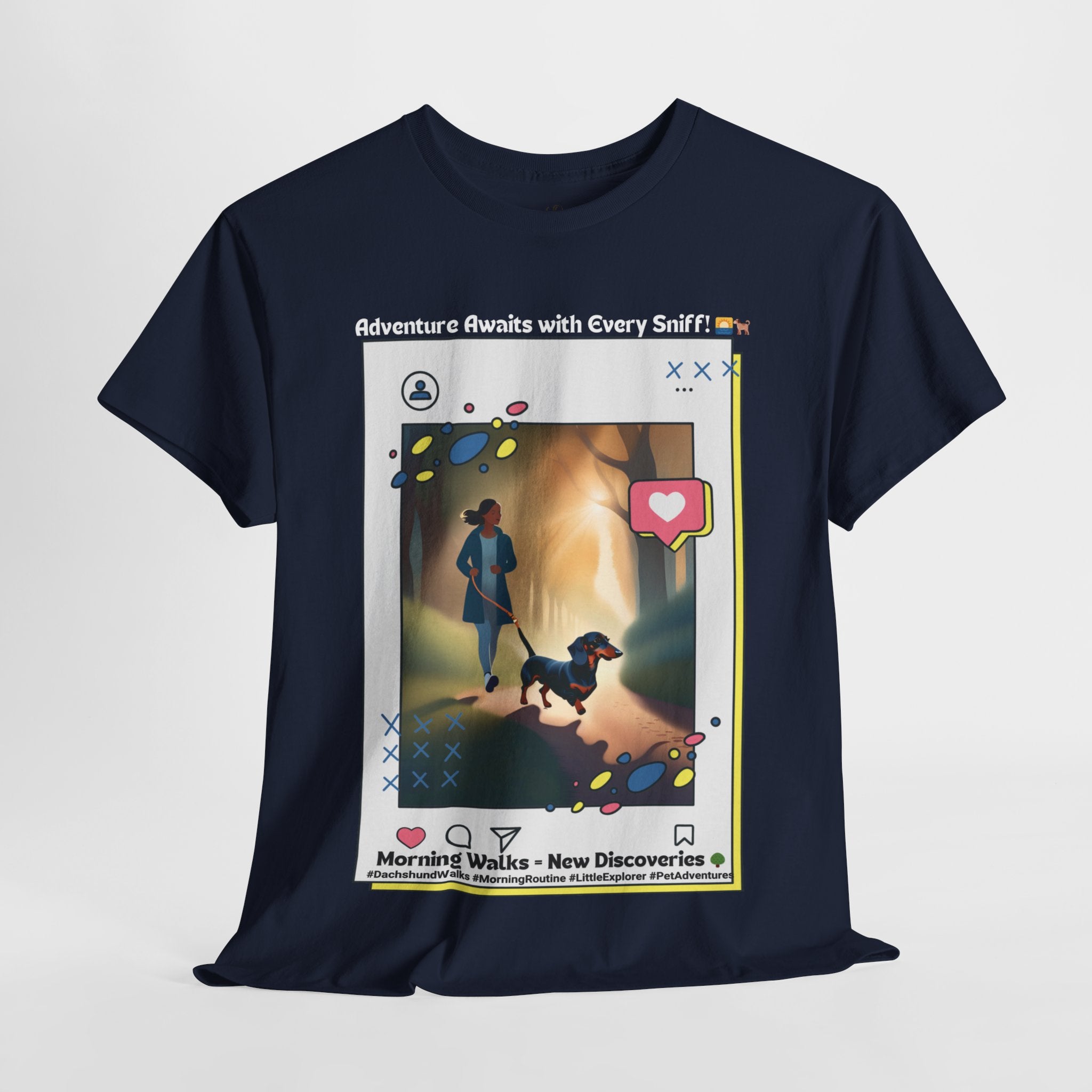 Are you a proud Dachshund owner who loves exploring the great outdoors with your furry friend? This t-shirt is a must-have for any dog parent who appreciates the adventurous spirit of their wiener dog. Our design captures the heartwarming moment of a Dachshund leading the way on a morning walk, nose close to the ground as it eagerly sniffs and explores the surroundings.