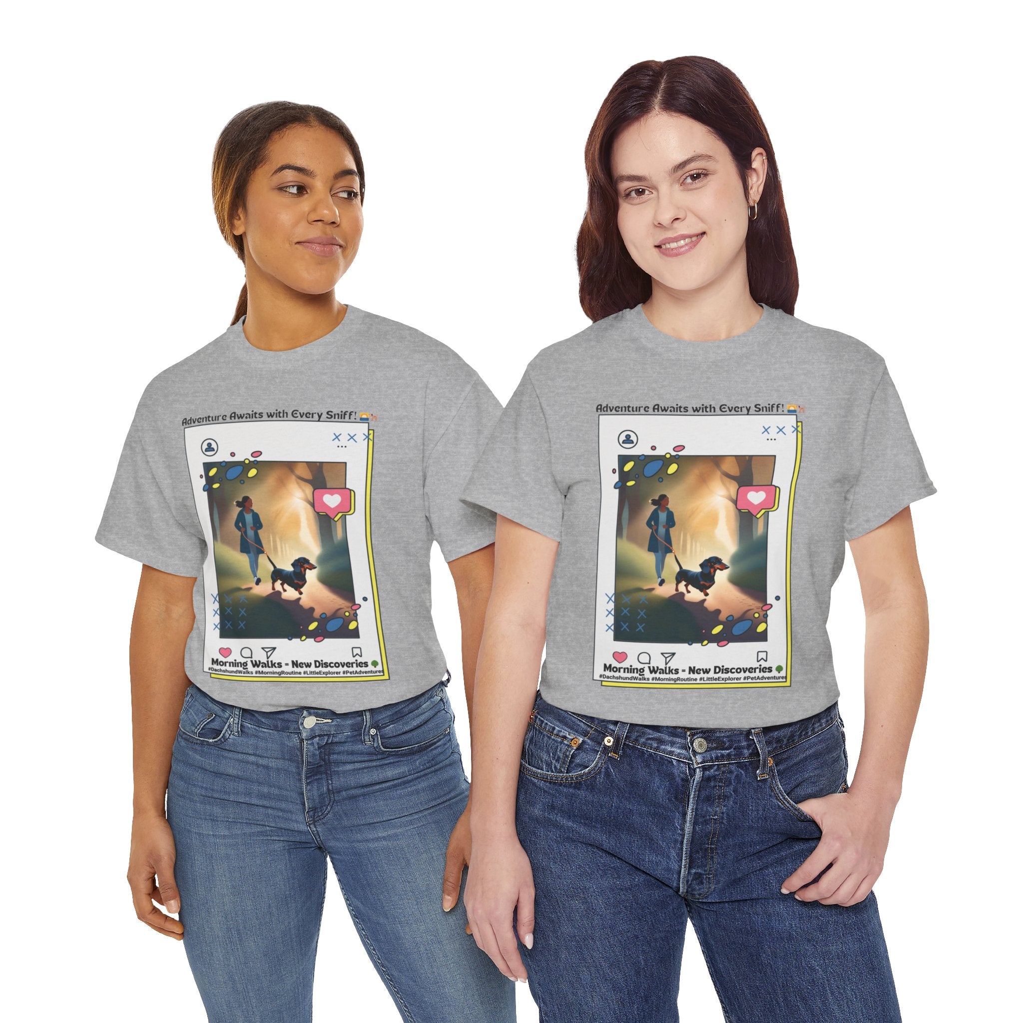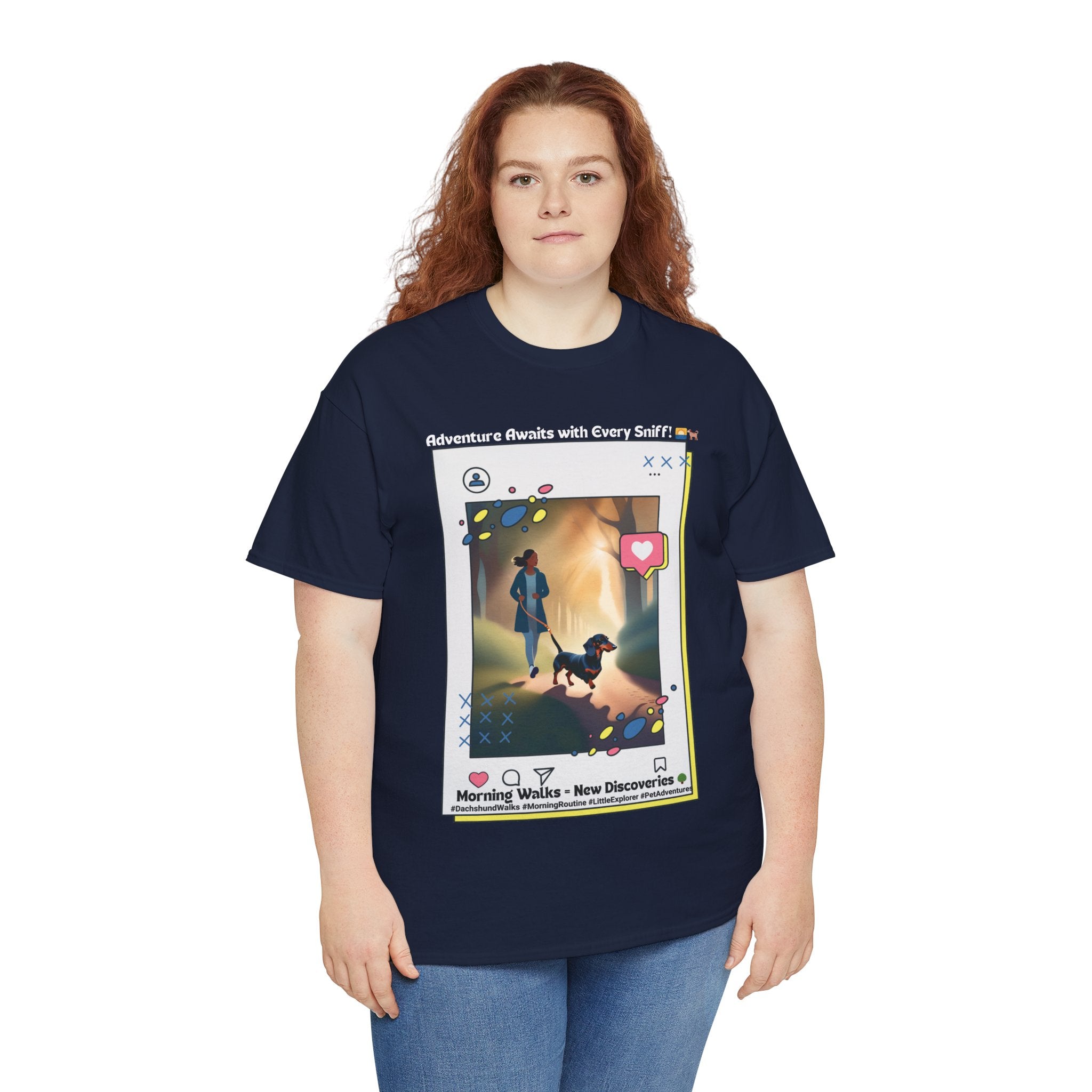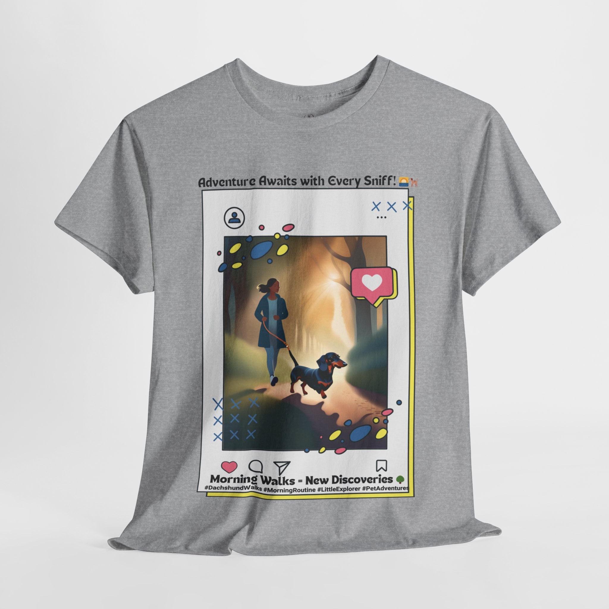 Are you a proud Dachshund owner who loves exploring the great outdoors with your furry friend? This t-shirt is a must-have for any dog parent who appreciates the adventurous spirit of their wiener dog. Our design captures the heartwarming moment of a Dachshund leading the way on a morning walk, nose close to the ground as it eagerly sniffs and explores the surroundings.