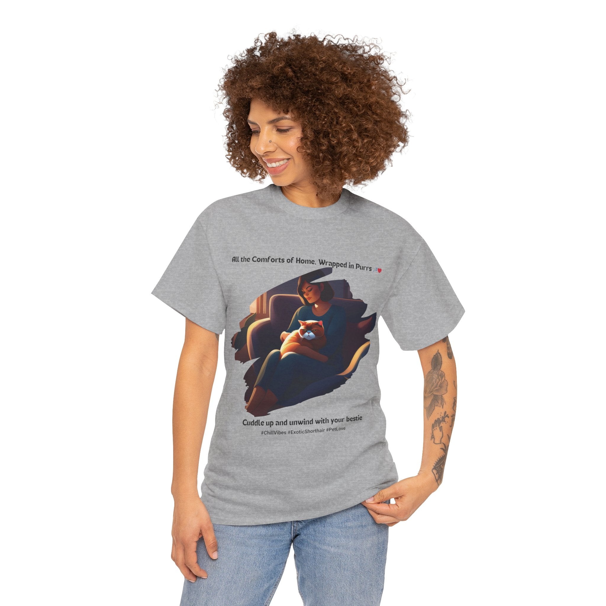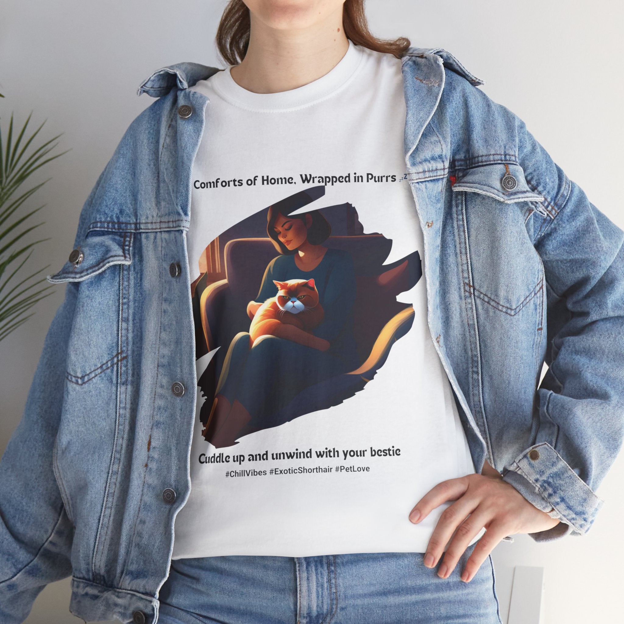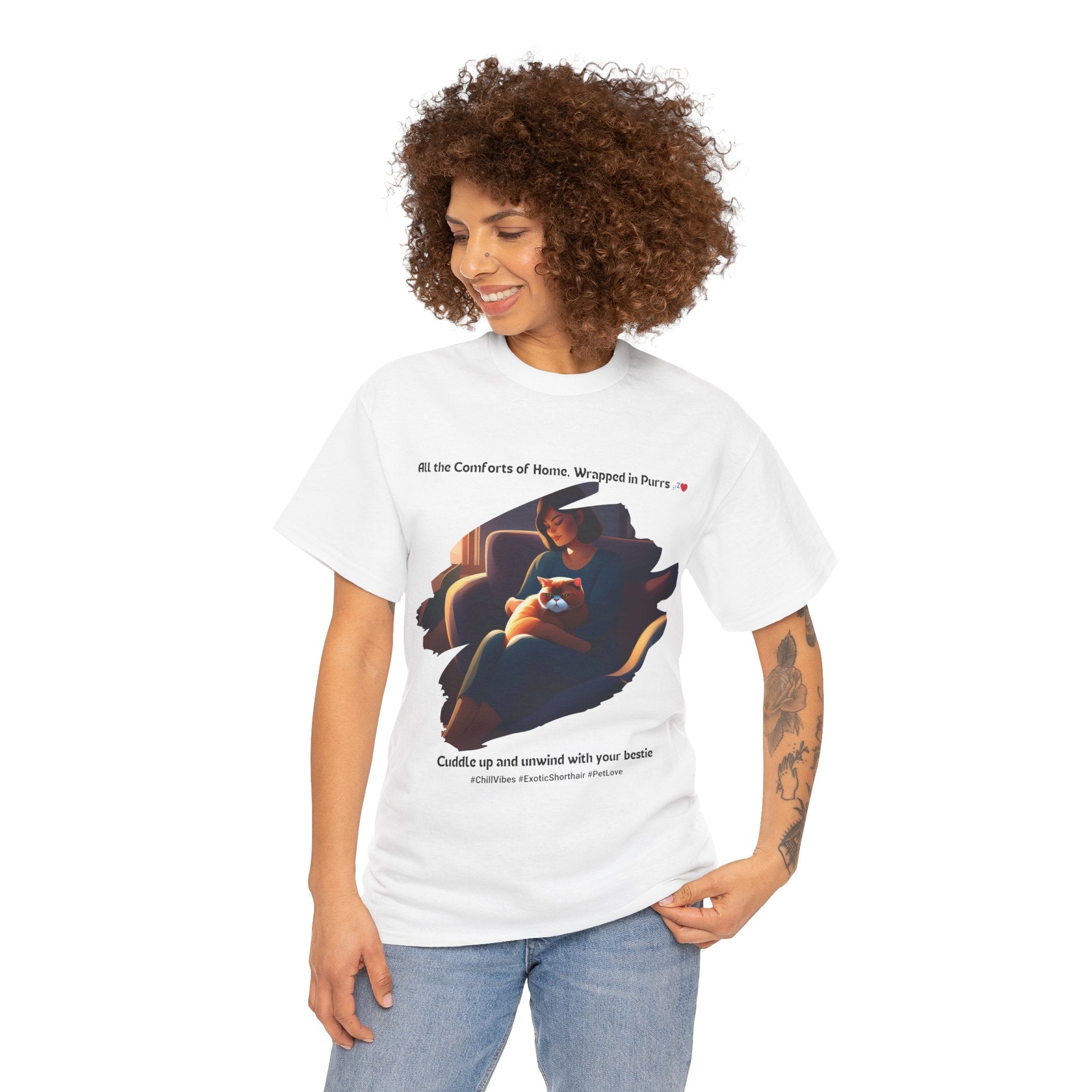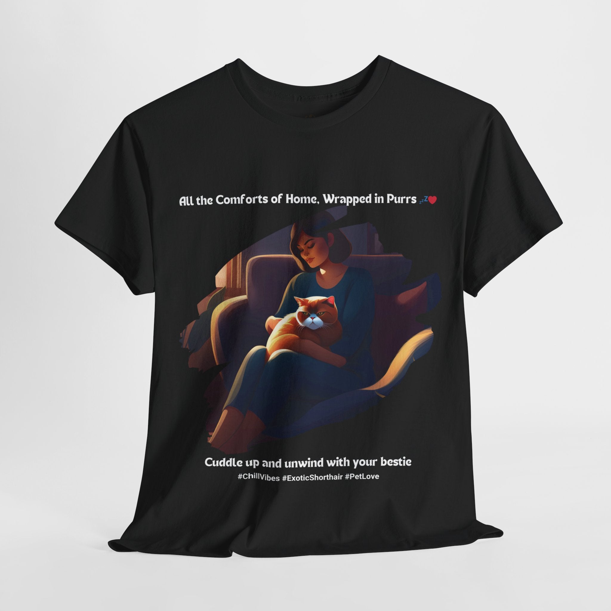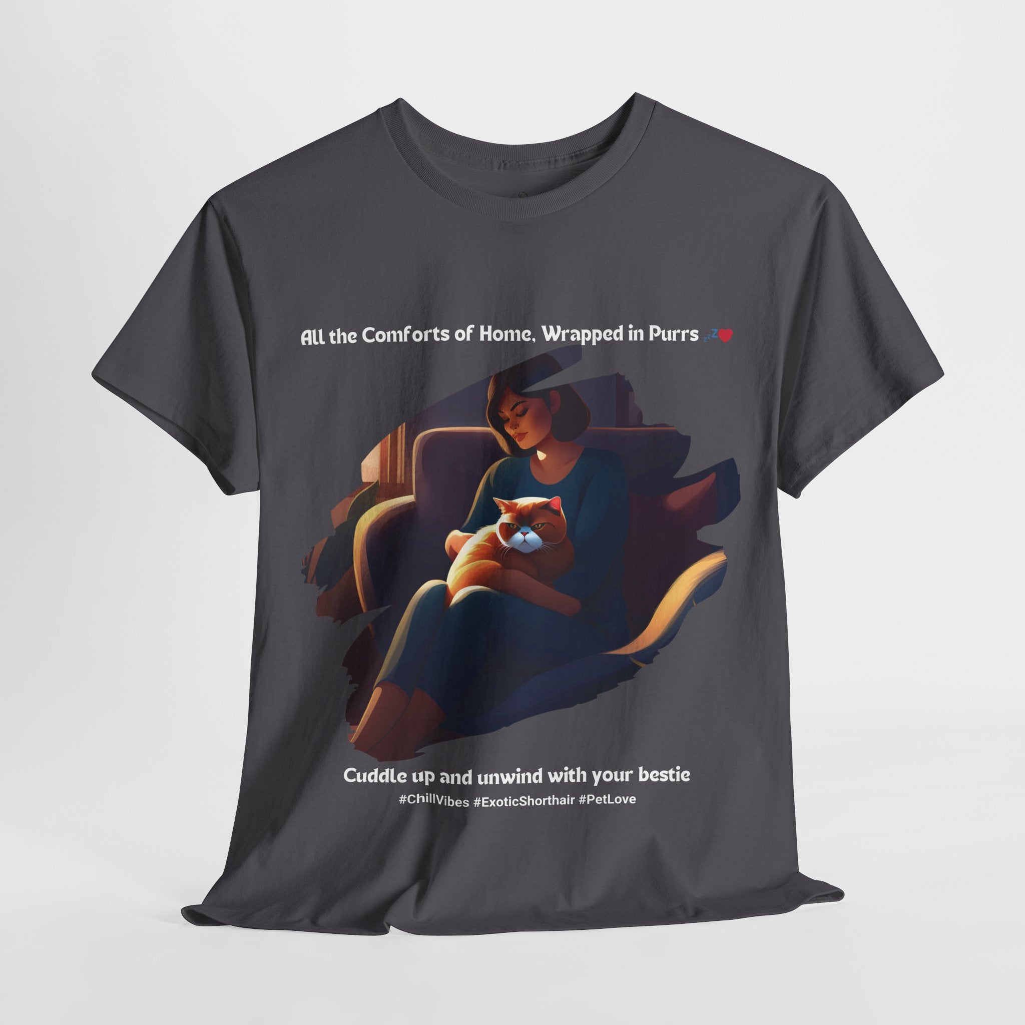 Are you a proud Exotic Shorthair owner who cherishes the cozy and comforting presence of your furry friend? This t-shirt is a must-have for any cat parent who appreciates the warmth and tranquility their feline companion brings. Our design captures the heartwarming moment of a human cuddling with an Exotic Shorthair, enjoying the ultimate comfort and relaxation.