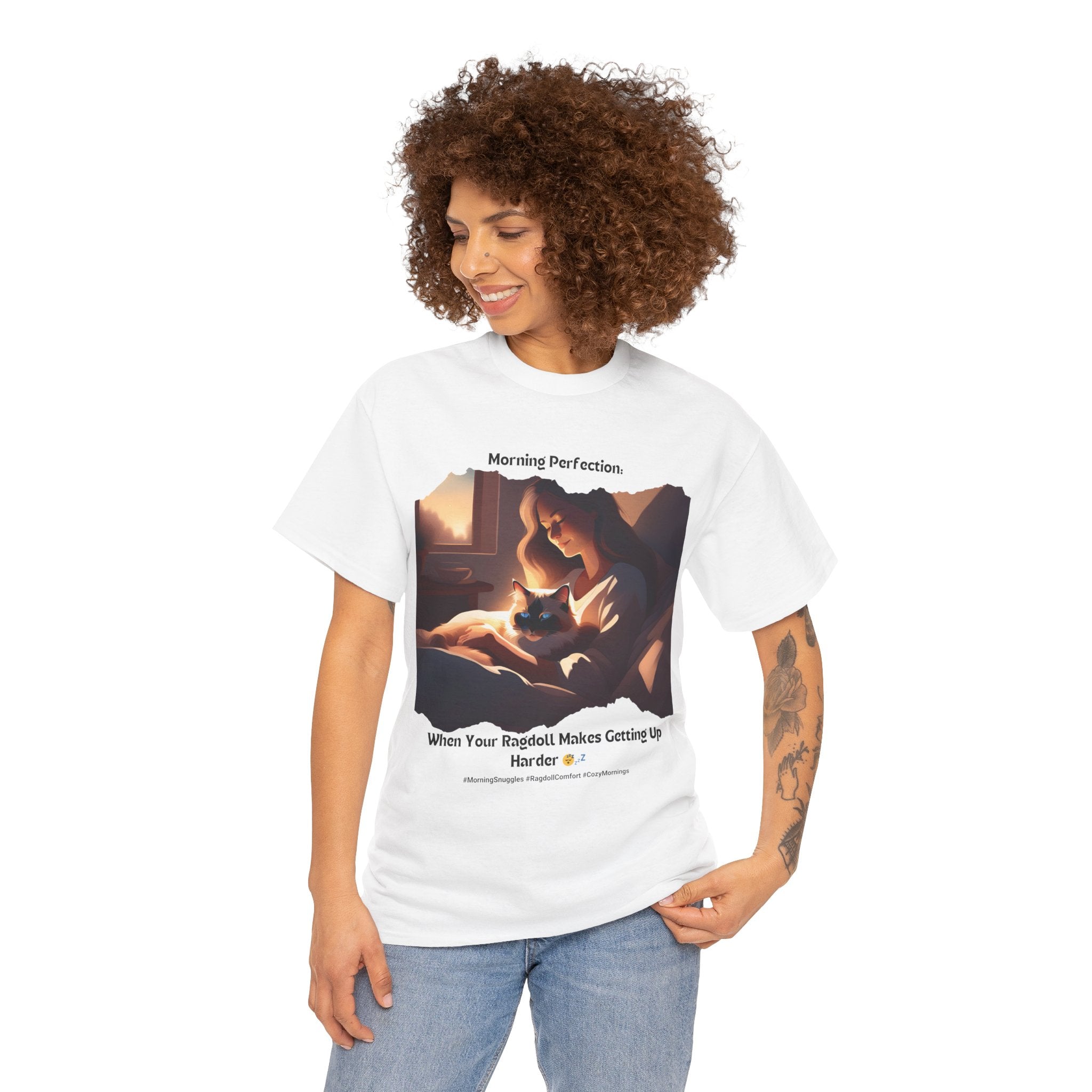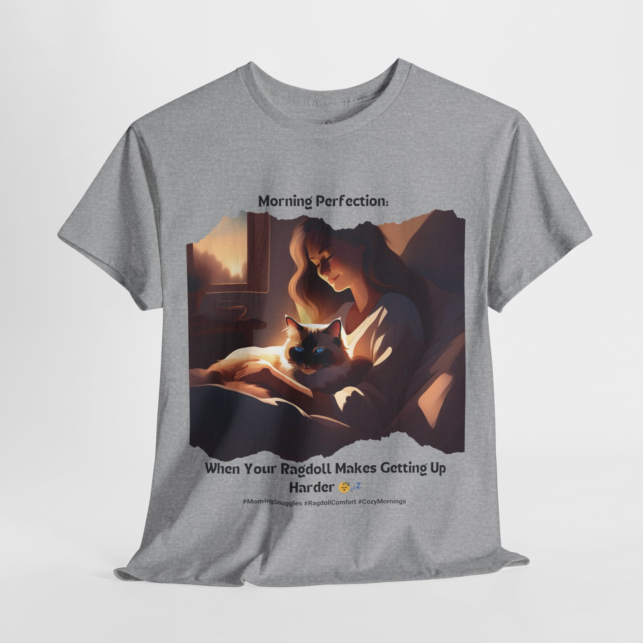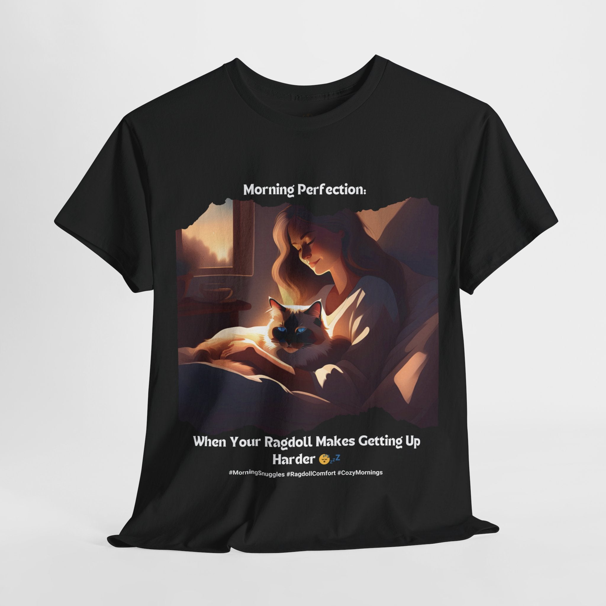 Start your day off right with a dose of pure bliss. Our Ragdoll t-shirt features a heartwarming image of a human cuddling with the adorable Ragdoll cat in bed. This design perfectly captures the irresistible urge to stay snuggled up and enjoy the morning's peaceful atmosphere.