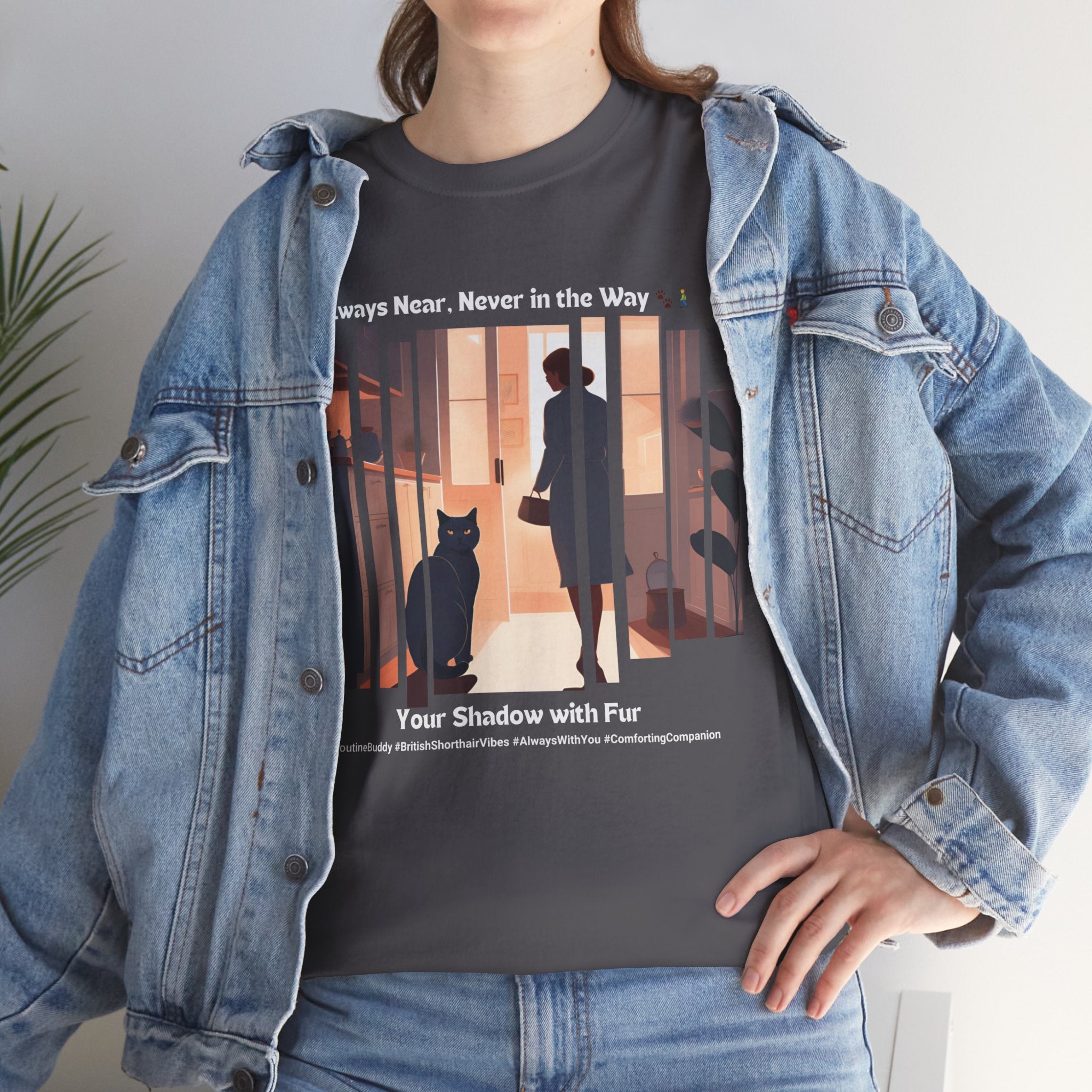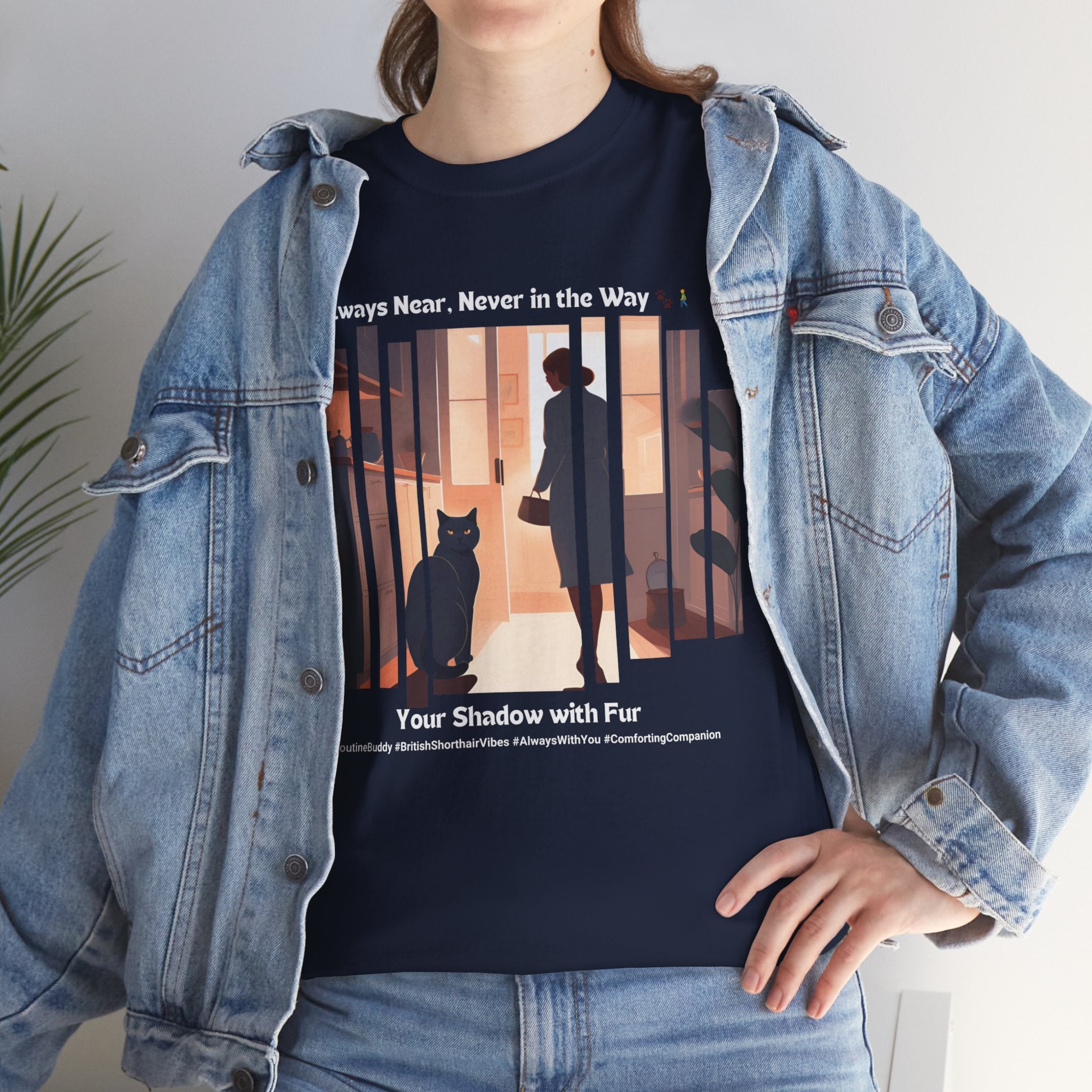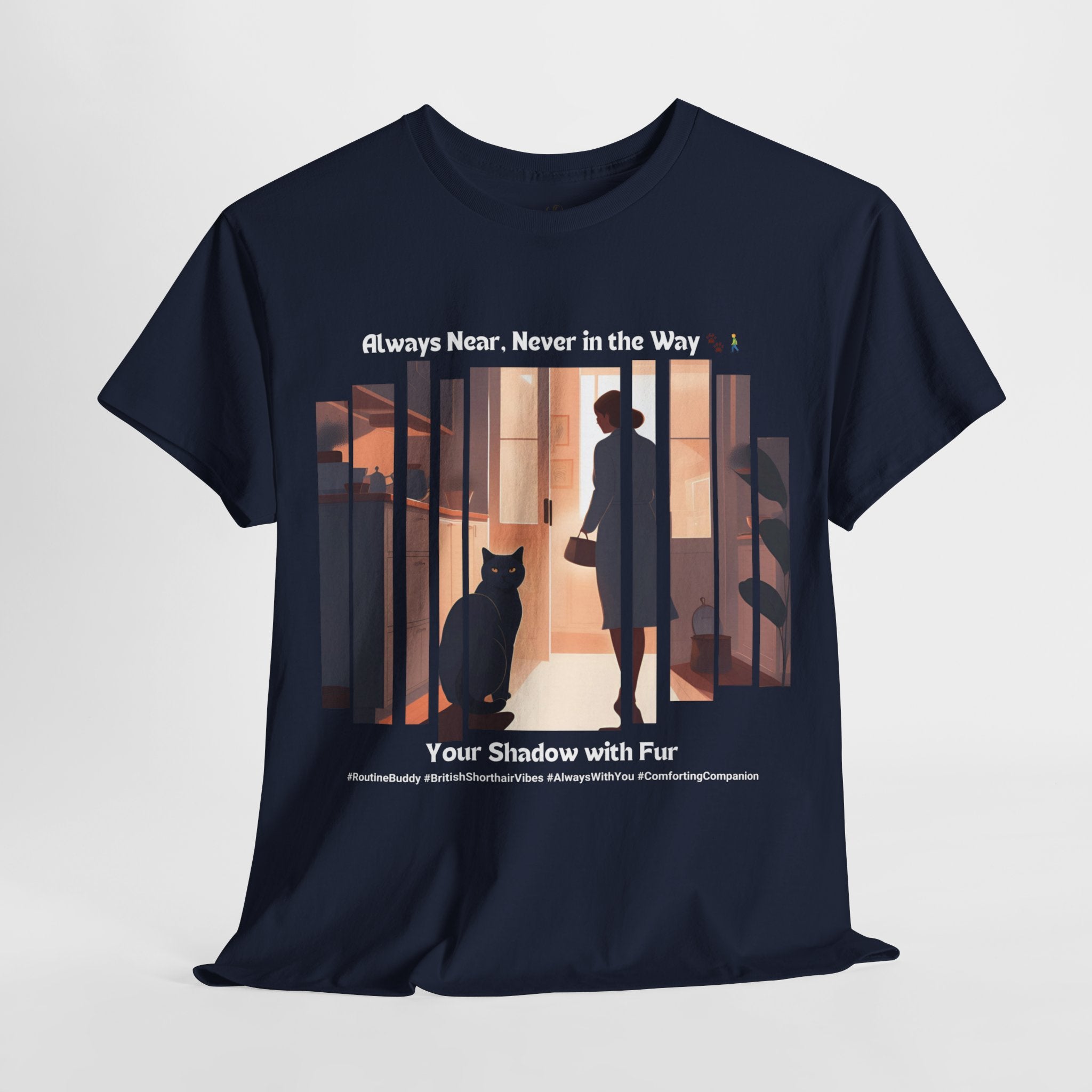 Experience the unwavering loyalty and comforting presence of a British Shorthair with this heartwarming t-shirt. Our design captures the essence of a British Shorthair's quiet companionship, always following their human's lead without being intrusive. This t-shirt is a tribute to the deep bond between cats and their owners, celebrating the simple joy of a loyal feline friend.