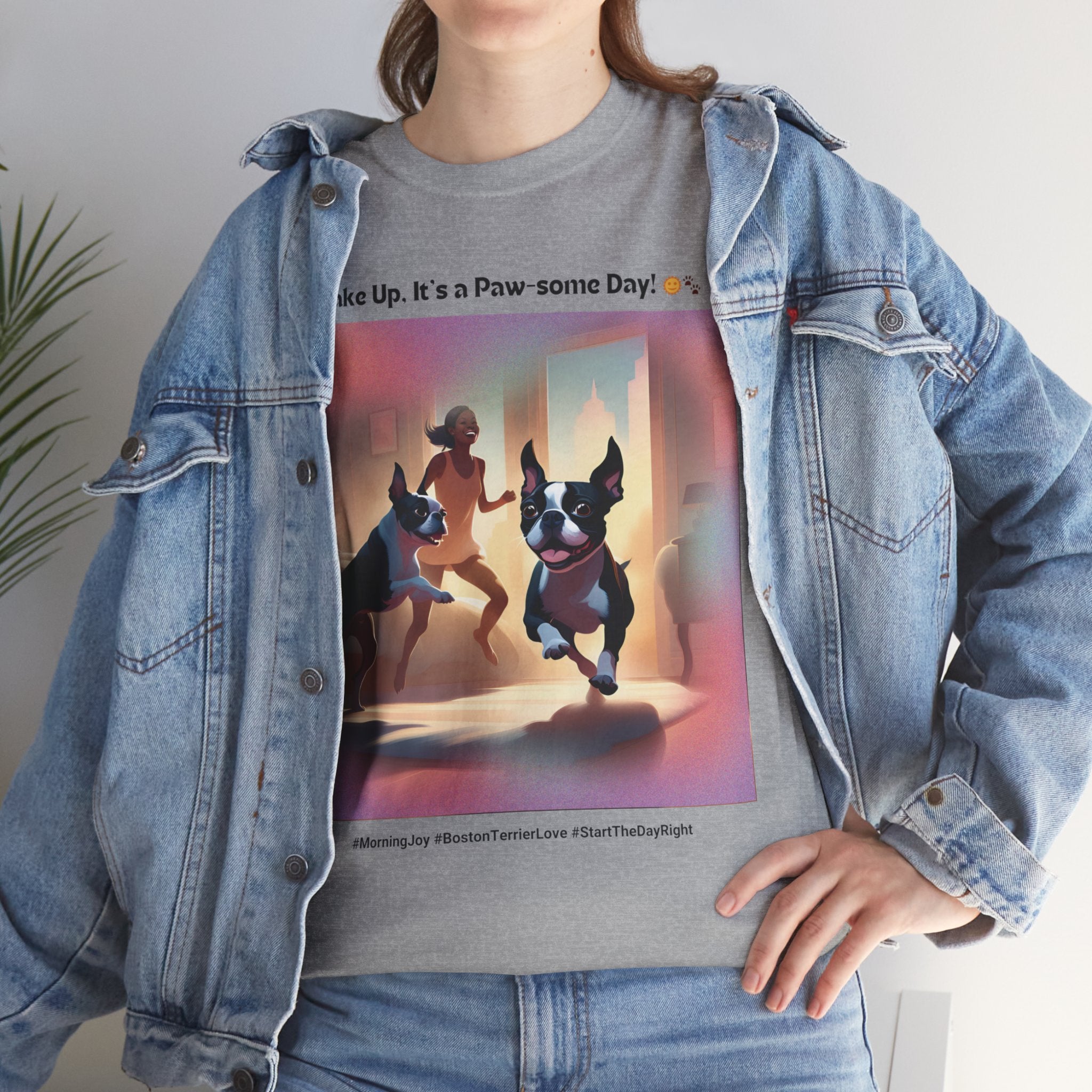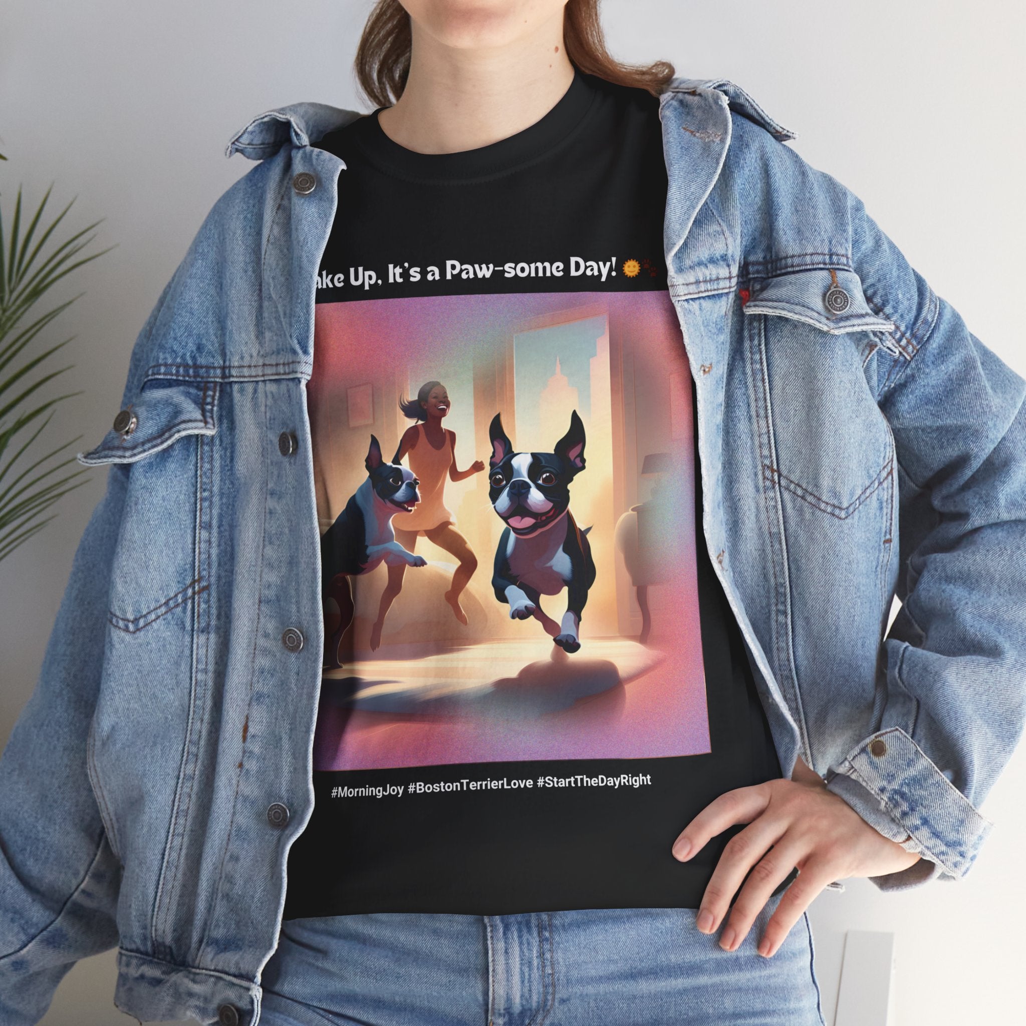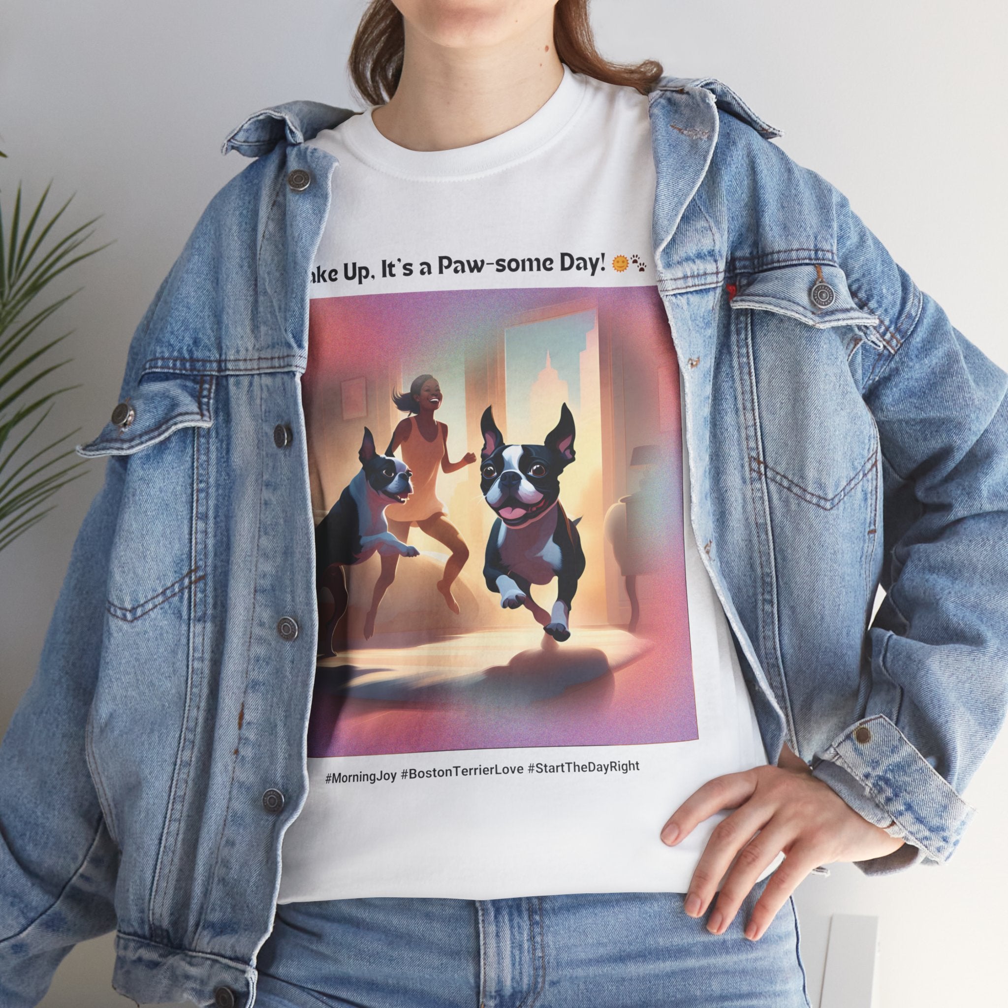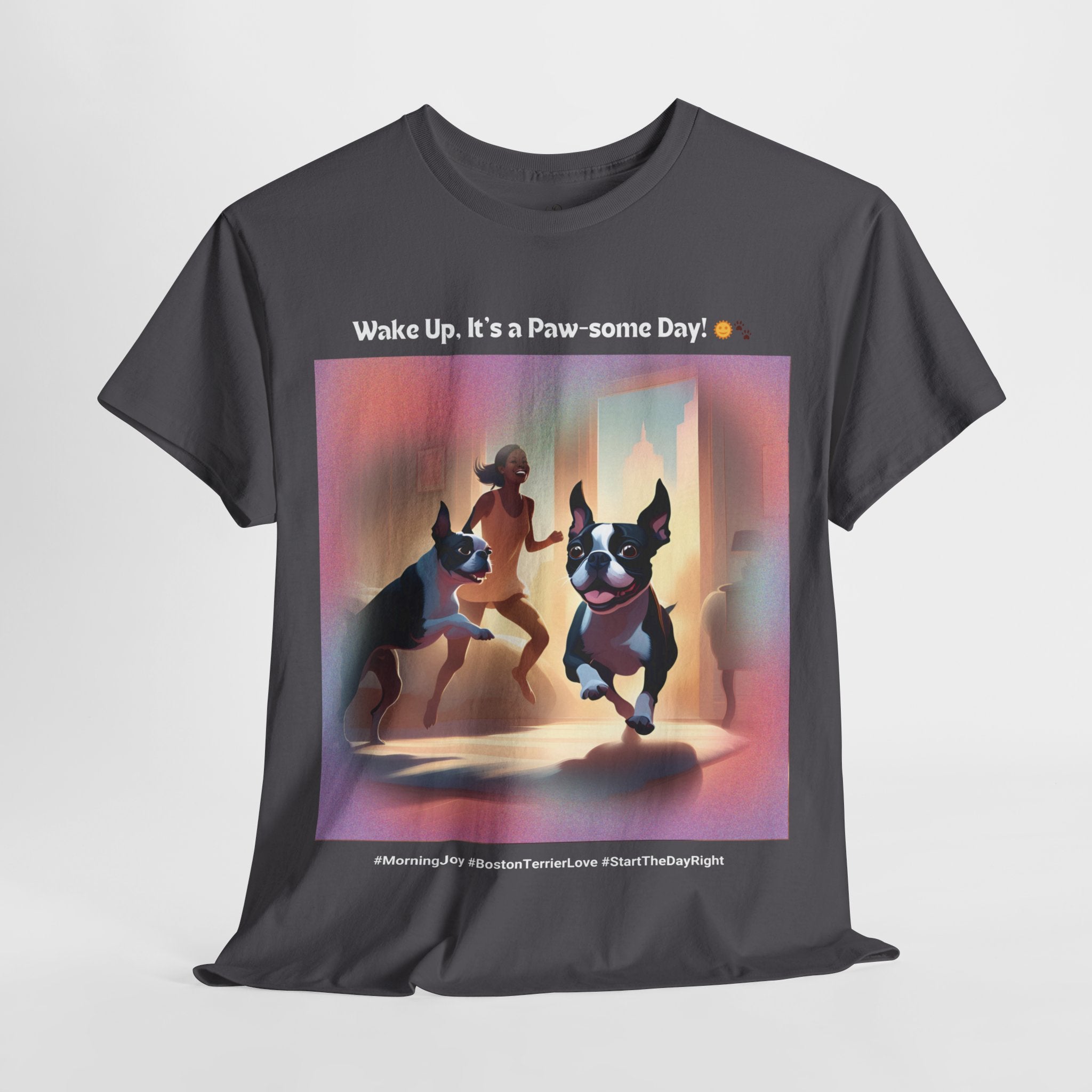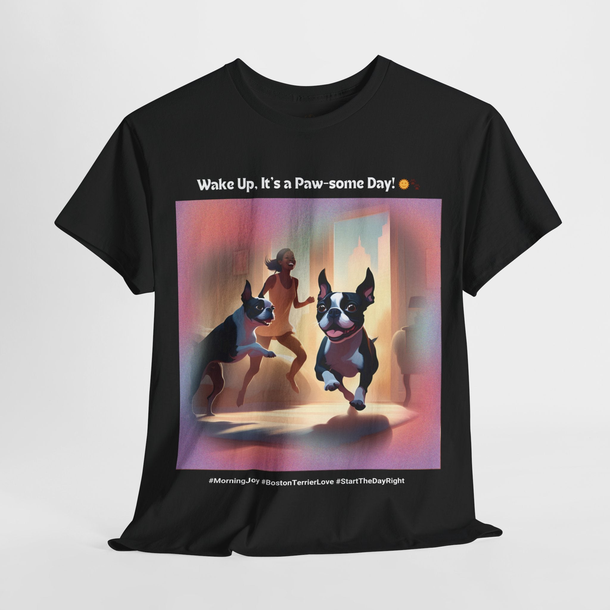 Are you a proud Boston Terrier owner who loves the energy and enthusiasm your furry friend brings to your mornings? This t-shirt is a must-have for any dog parent who appreciates the joy and companionship their canine companion provides. Our design features a human jumping for joy with two Boston Terriers, capturing the perfect way to start your day.