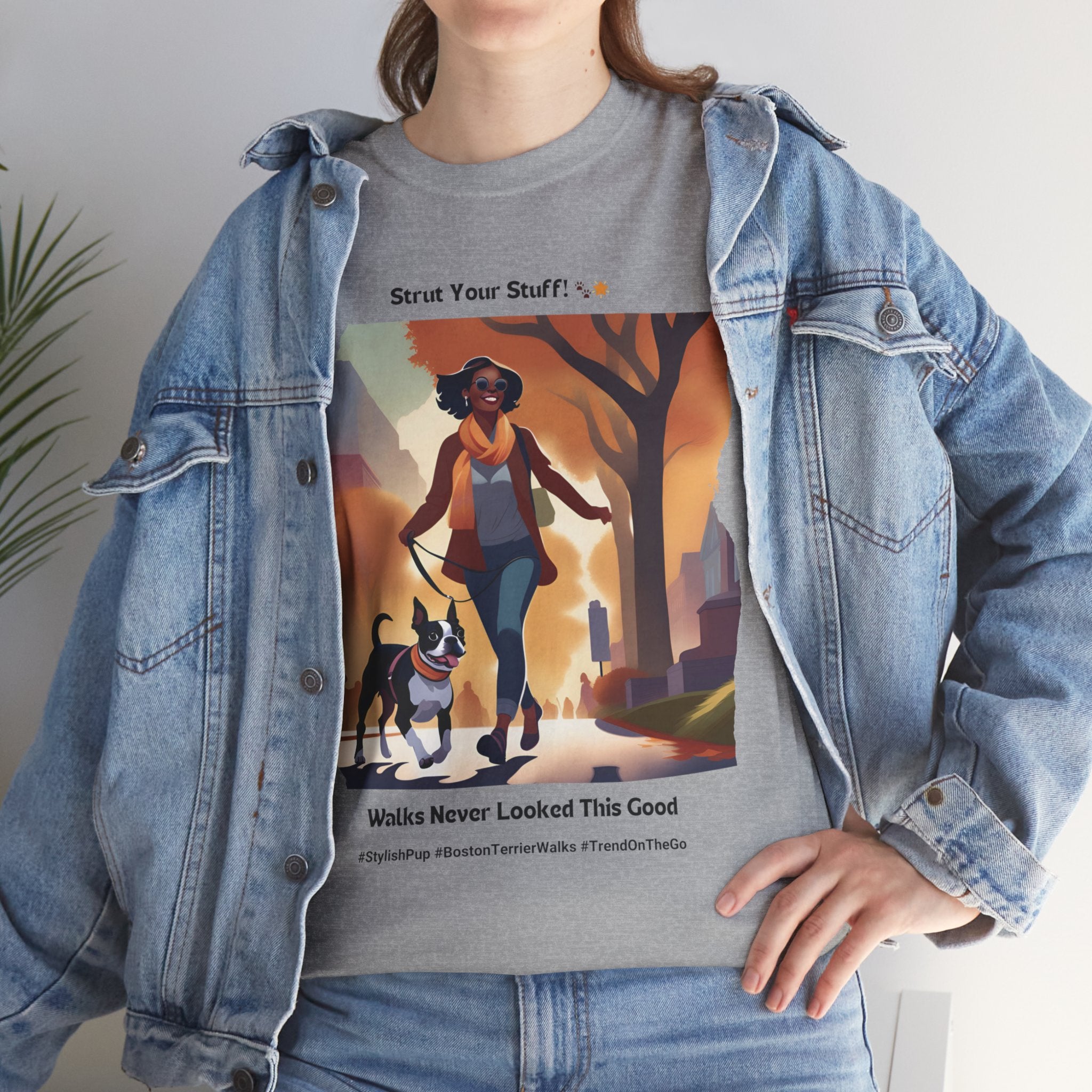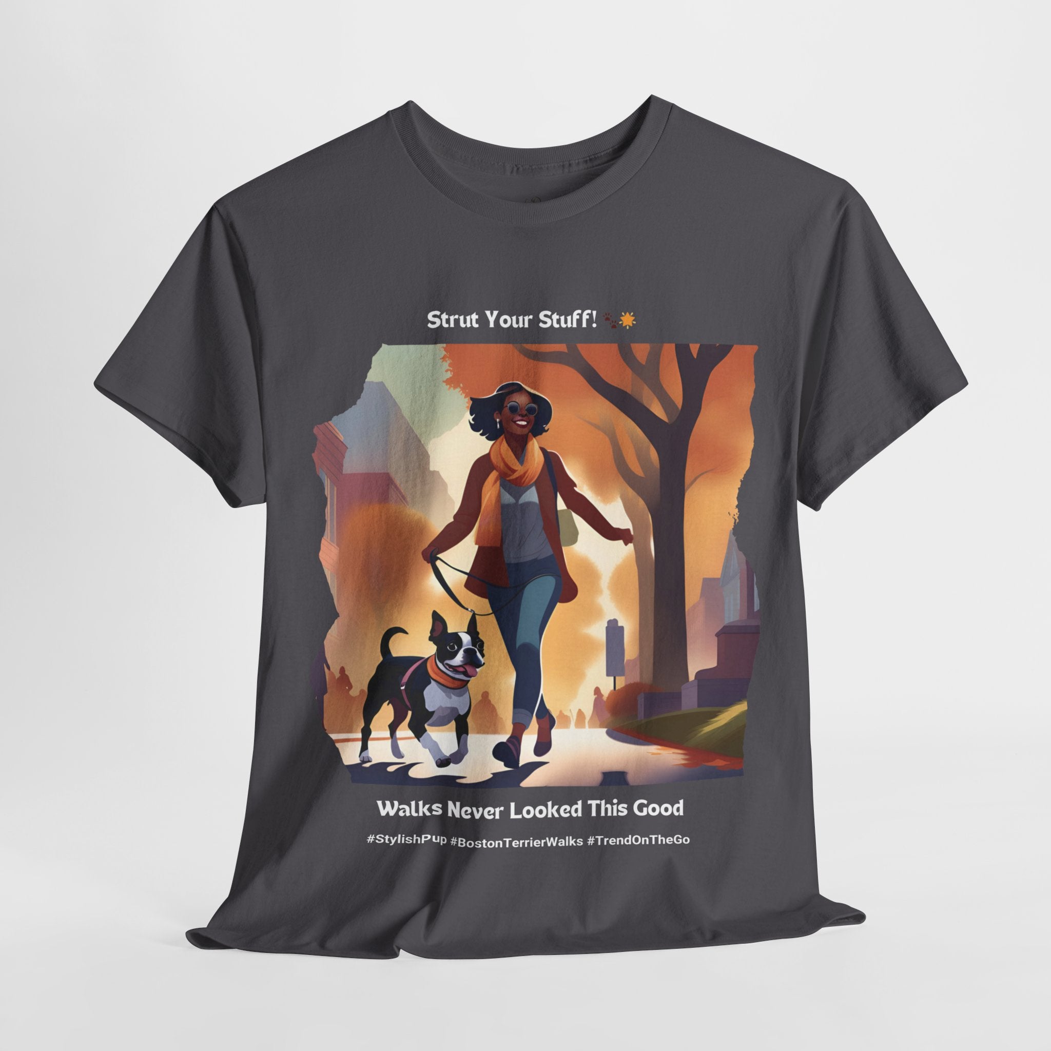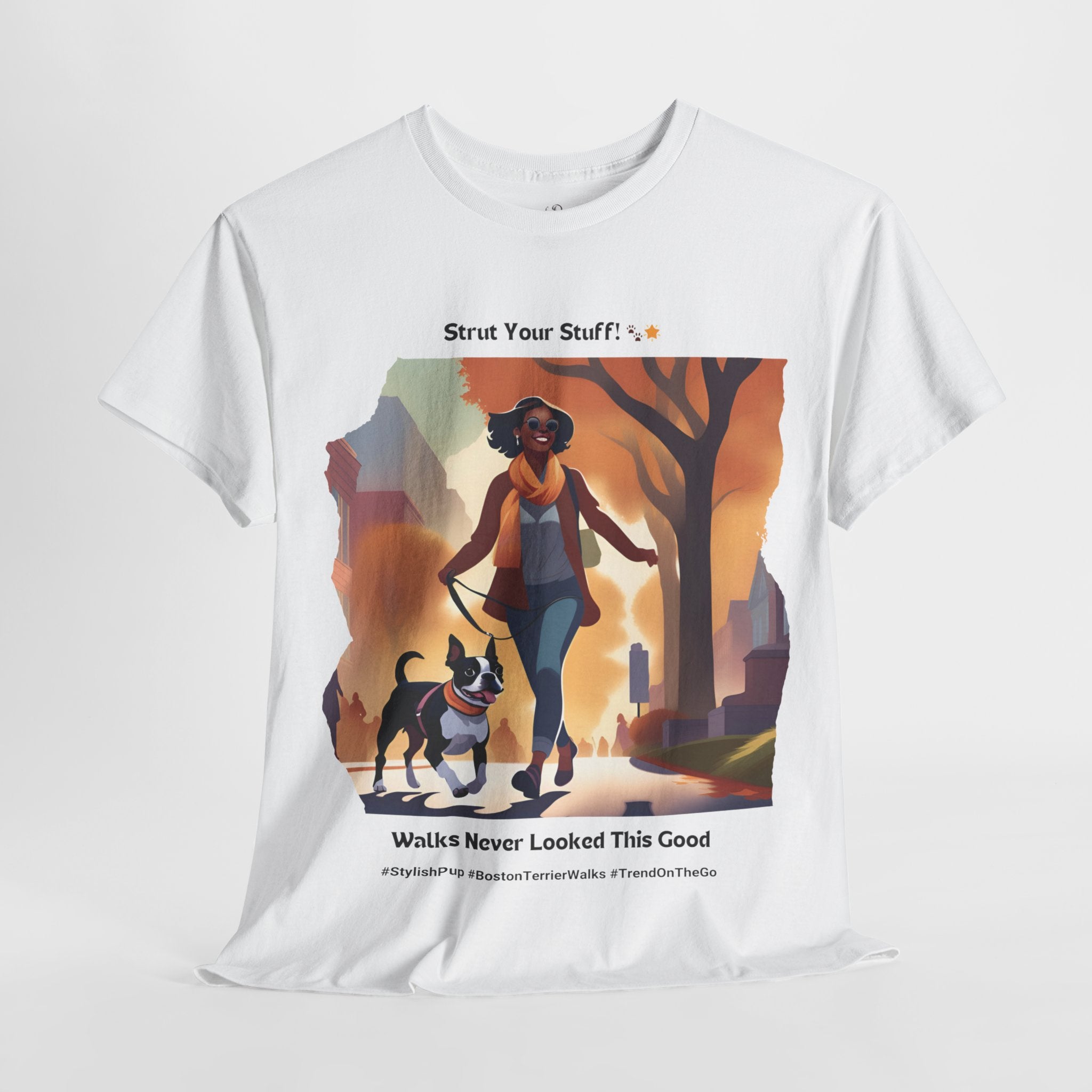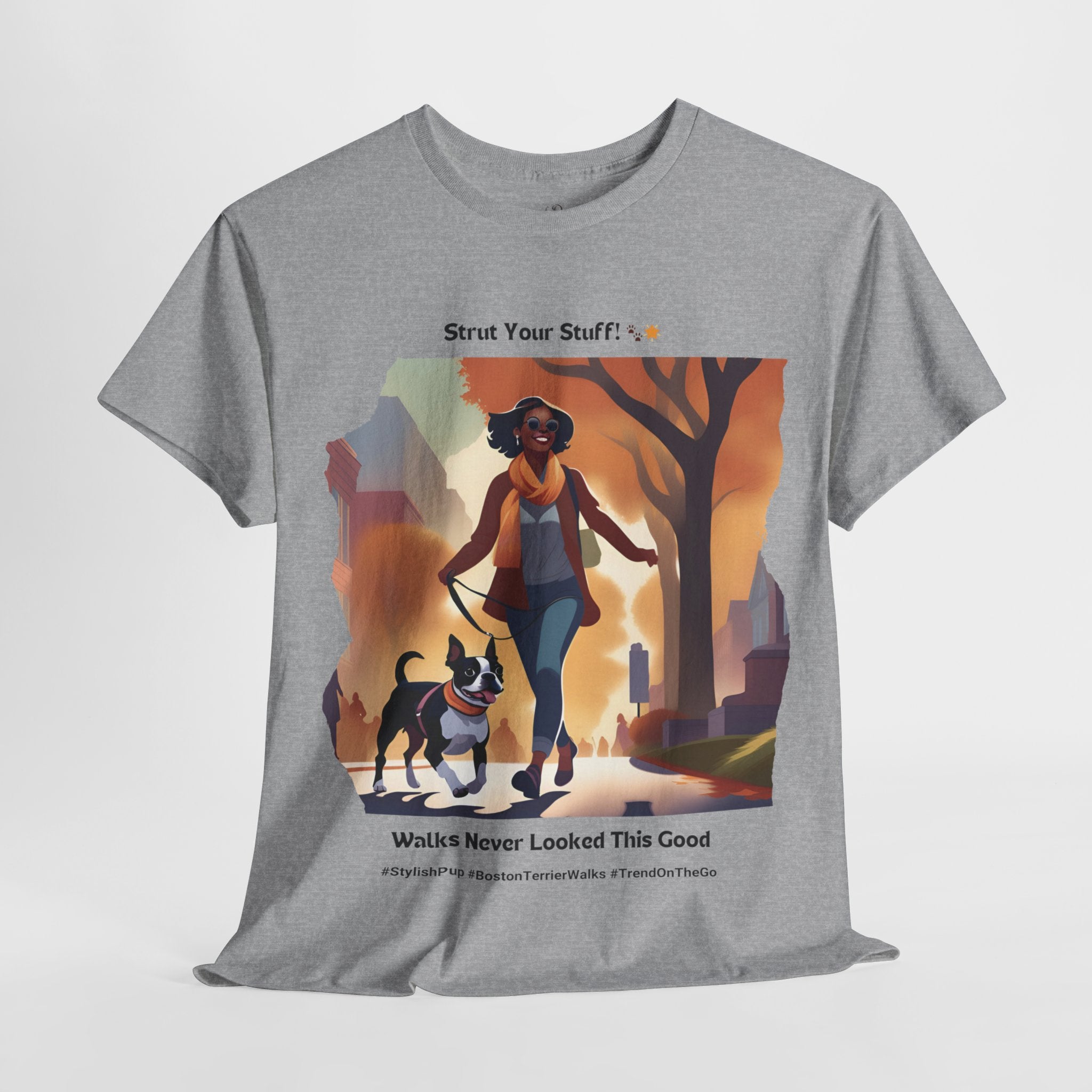 Are you a proud Boston Terrier owner who loves to take stylish walks with your furry friend? This t-shirt is a must-have for any dog parent who appreciates the fun and fashion-forward lifestyle of their canine companion. Our design features a human and a Boston Terrier strolling through the city, showcasing the perfect combination of style and companionship.