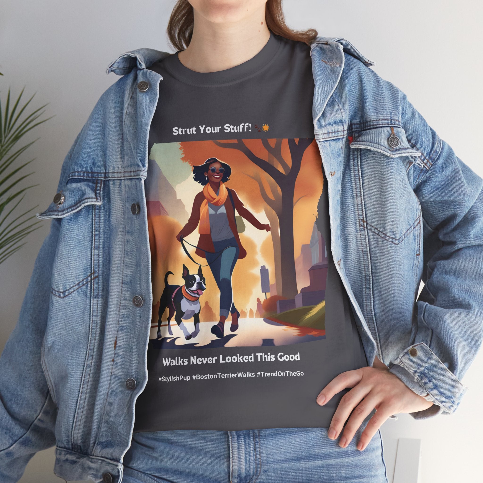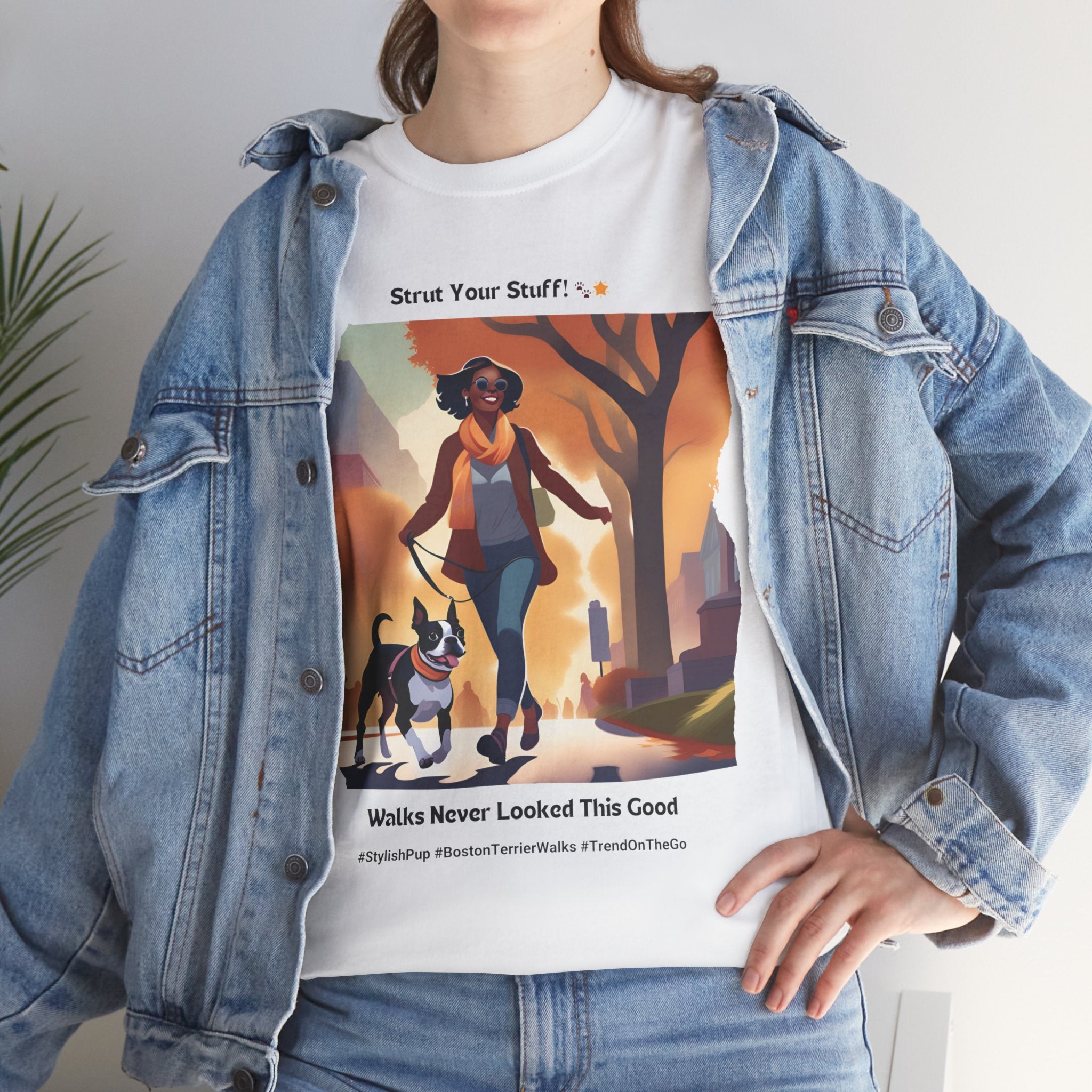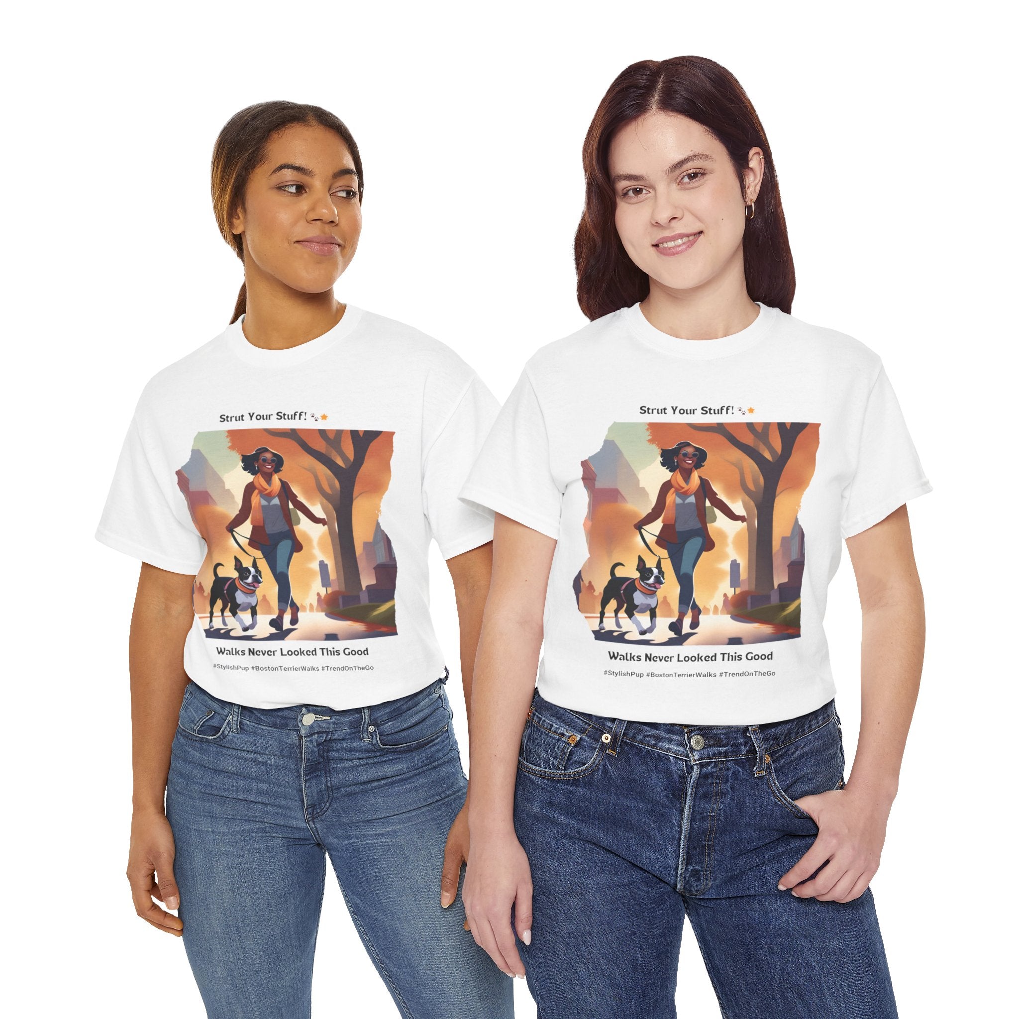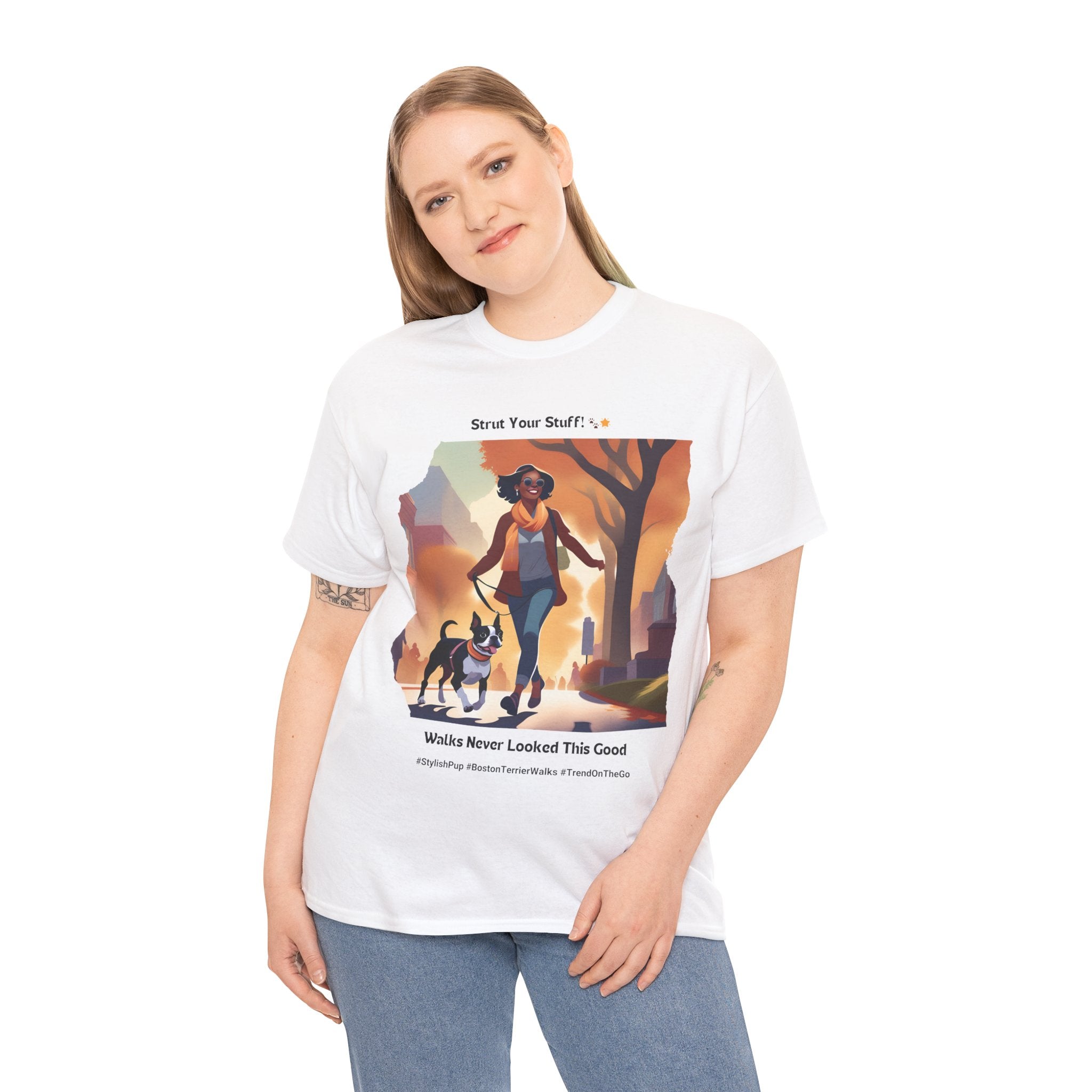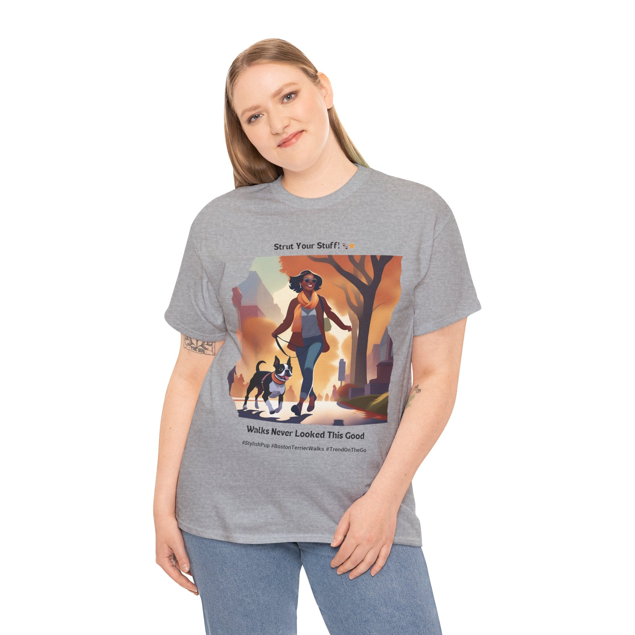 Are you a proud Boston Terrier owner who loves to take stylish walks with your furry friend? This t-shirt is a must-have for any dog parent who appreciates the fun and fashion-forward lifestyle of their canine companion. Our design features a human and a Boston Terrier strolling through the city, showcasing the perfect combination of style and companionship.