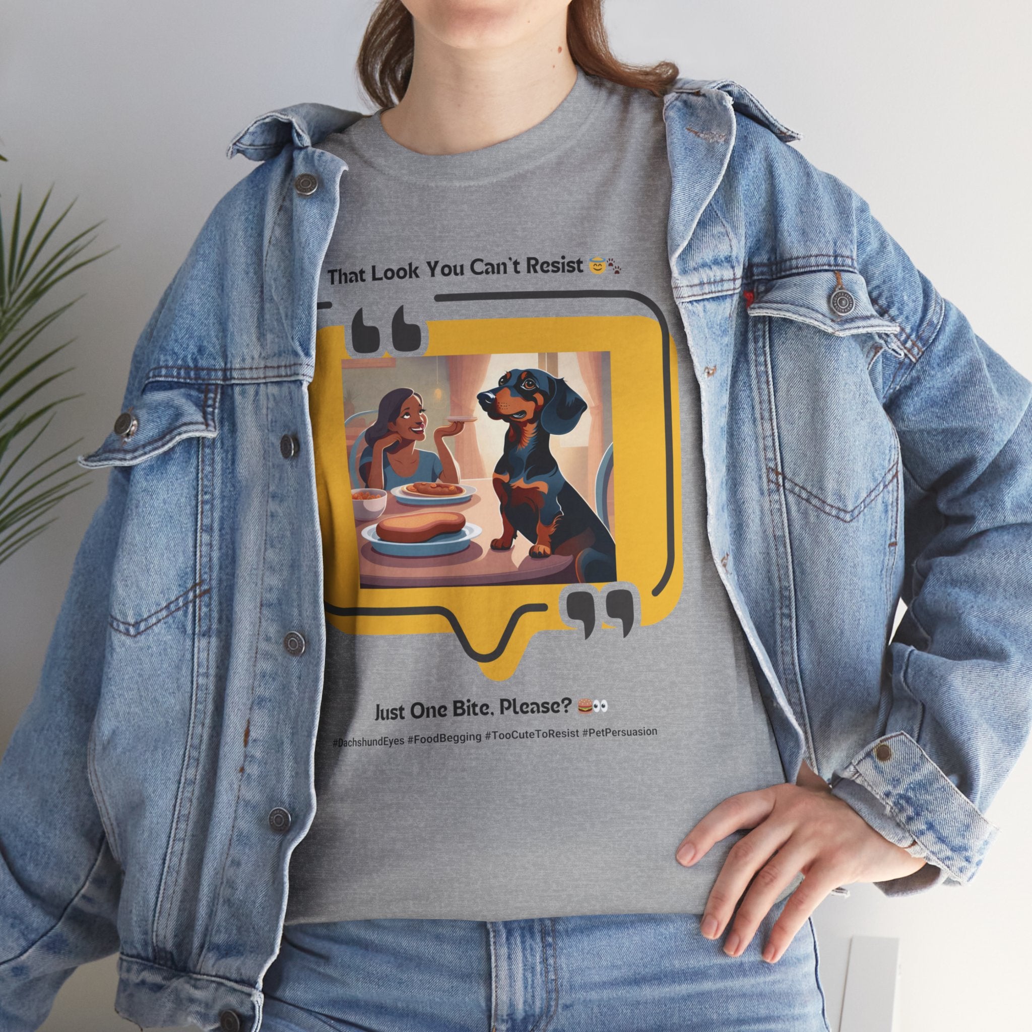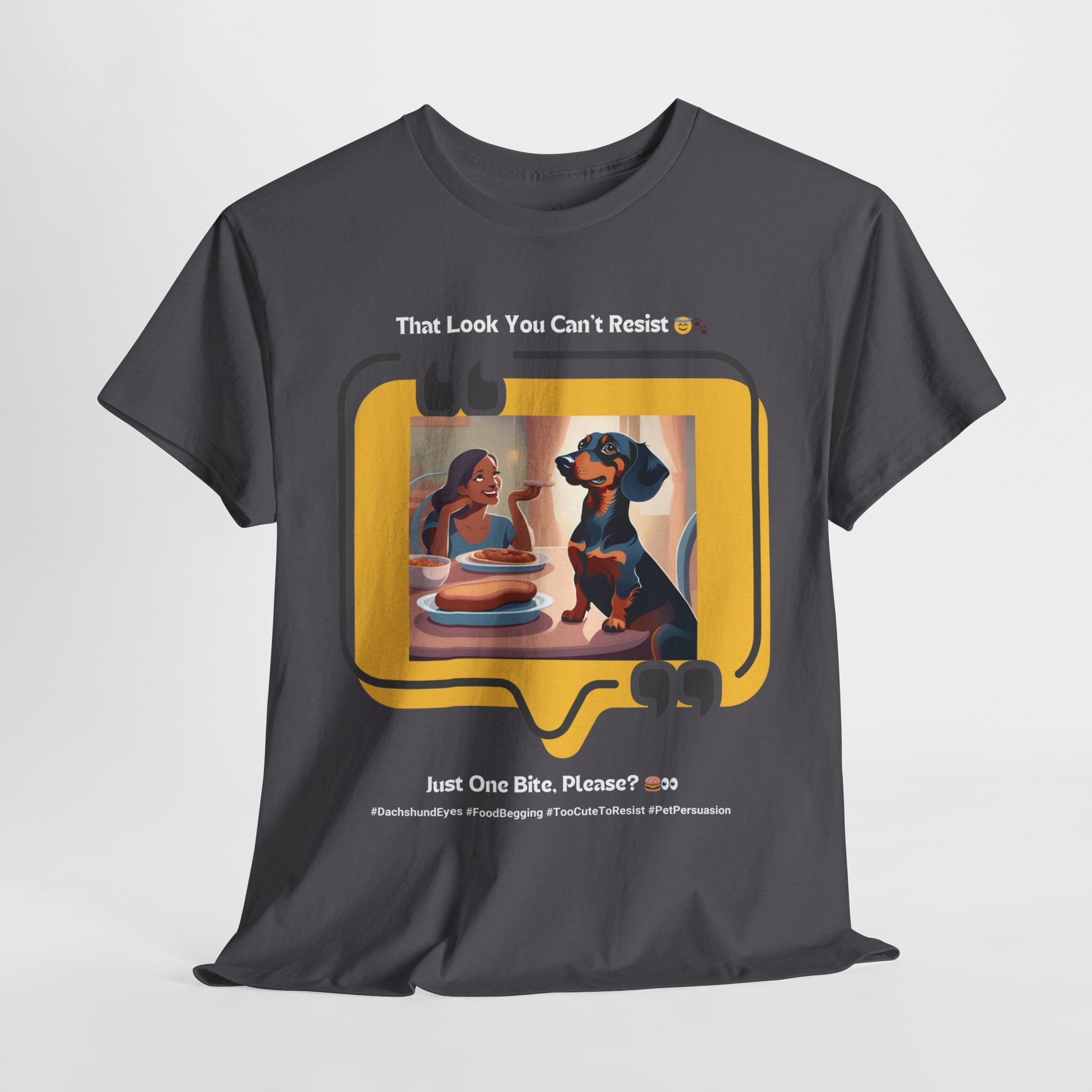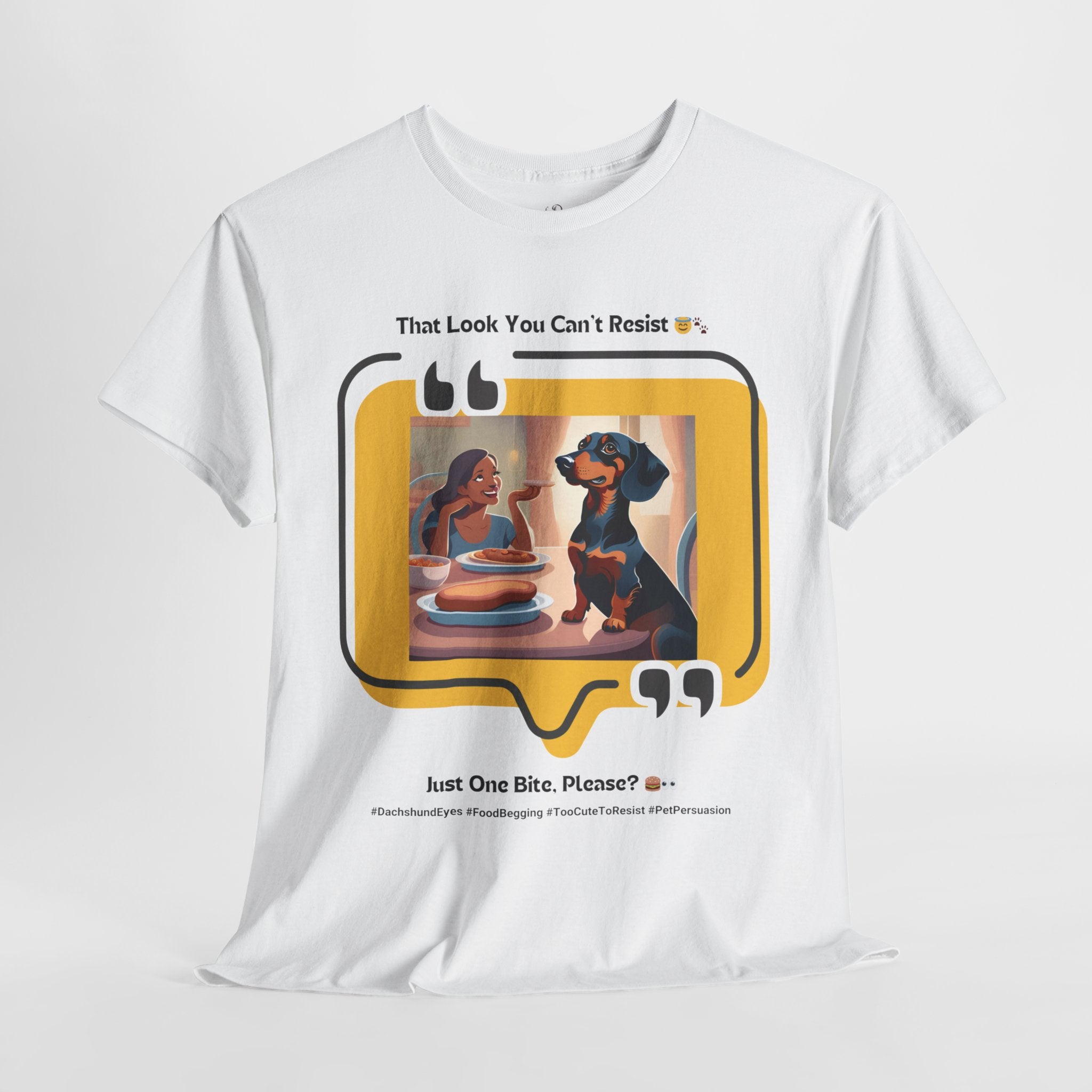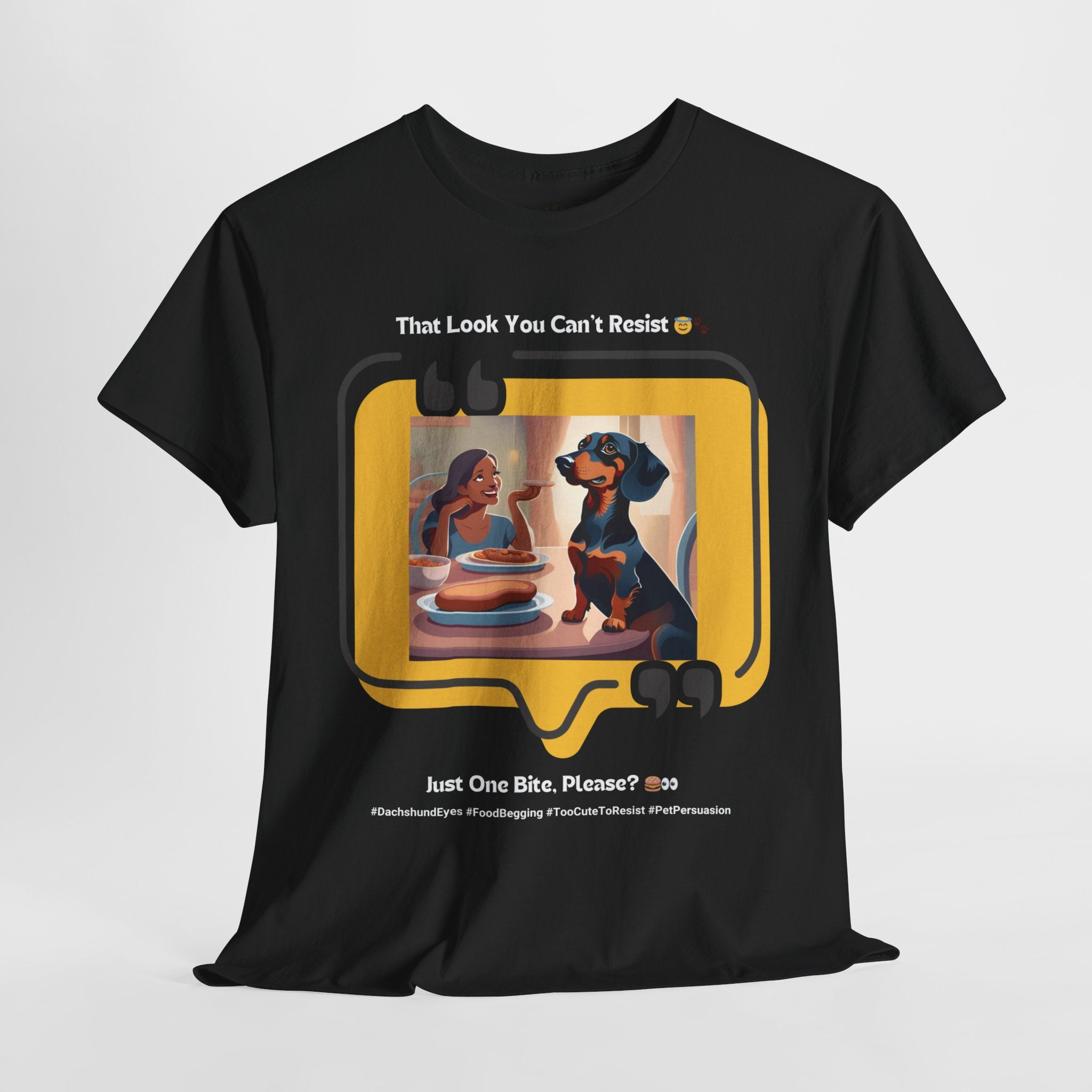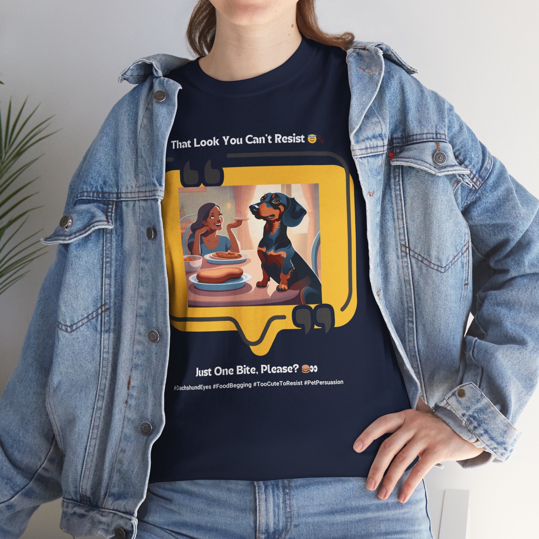 Are you a proud Dachshund owner who's constantly melting at your dog's adorable begging eyes? This t-shirt is a must-have for any dog parent who appreciates the playful and persuasive nature of their wiener dog. Our design captures the heartwarming moment of a Dachshund looking up with those irresistible puppy dog eyes, begging for a bite of your food.