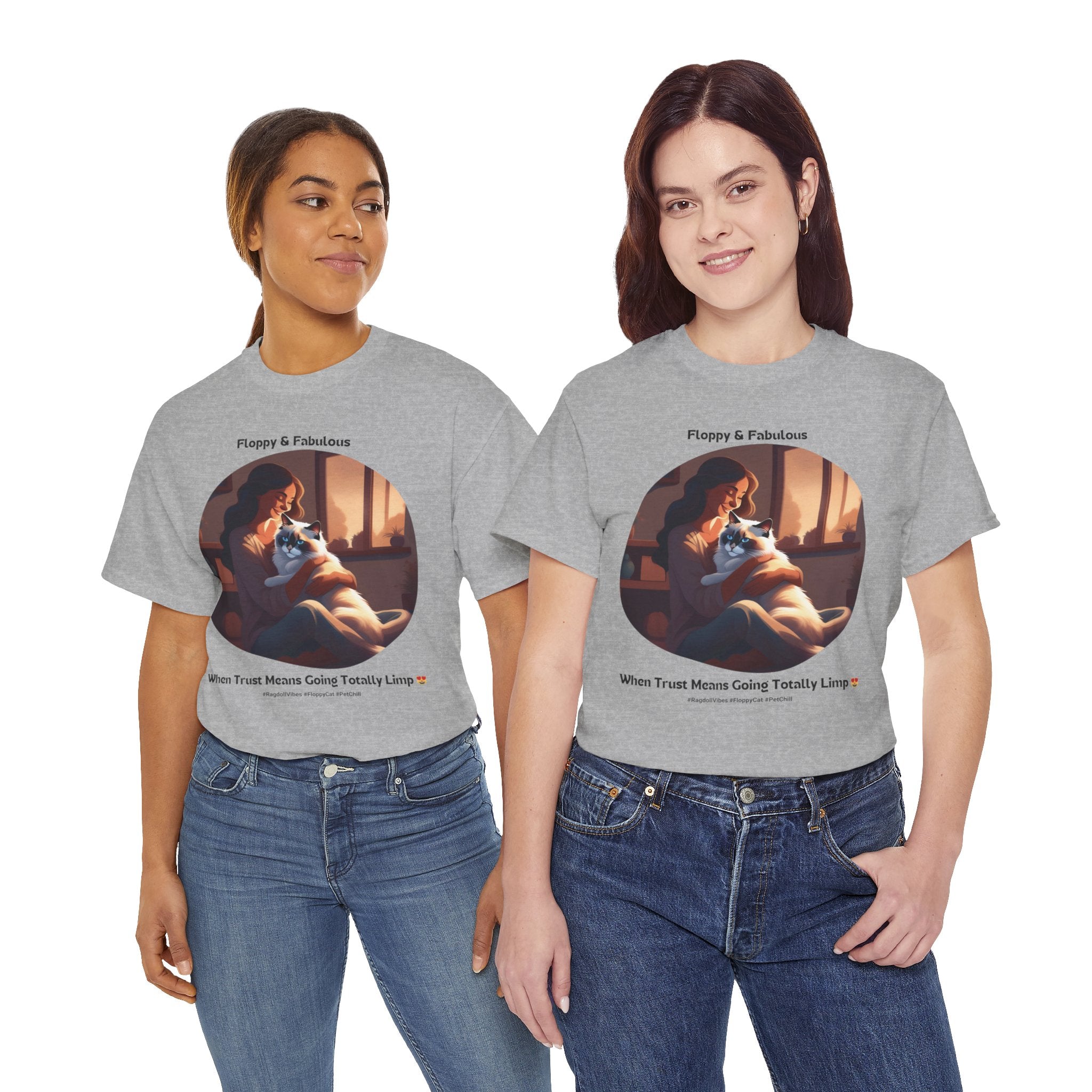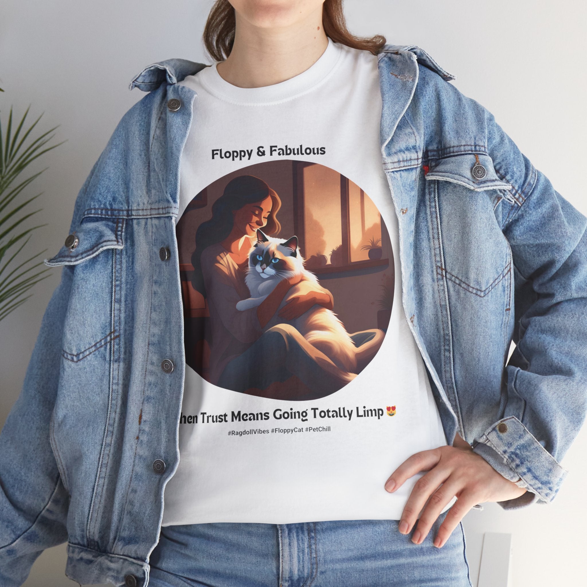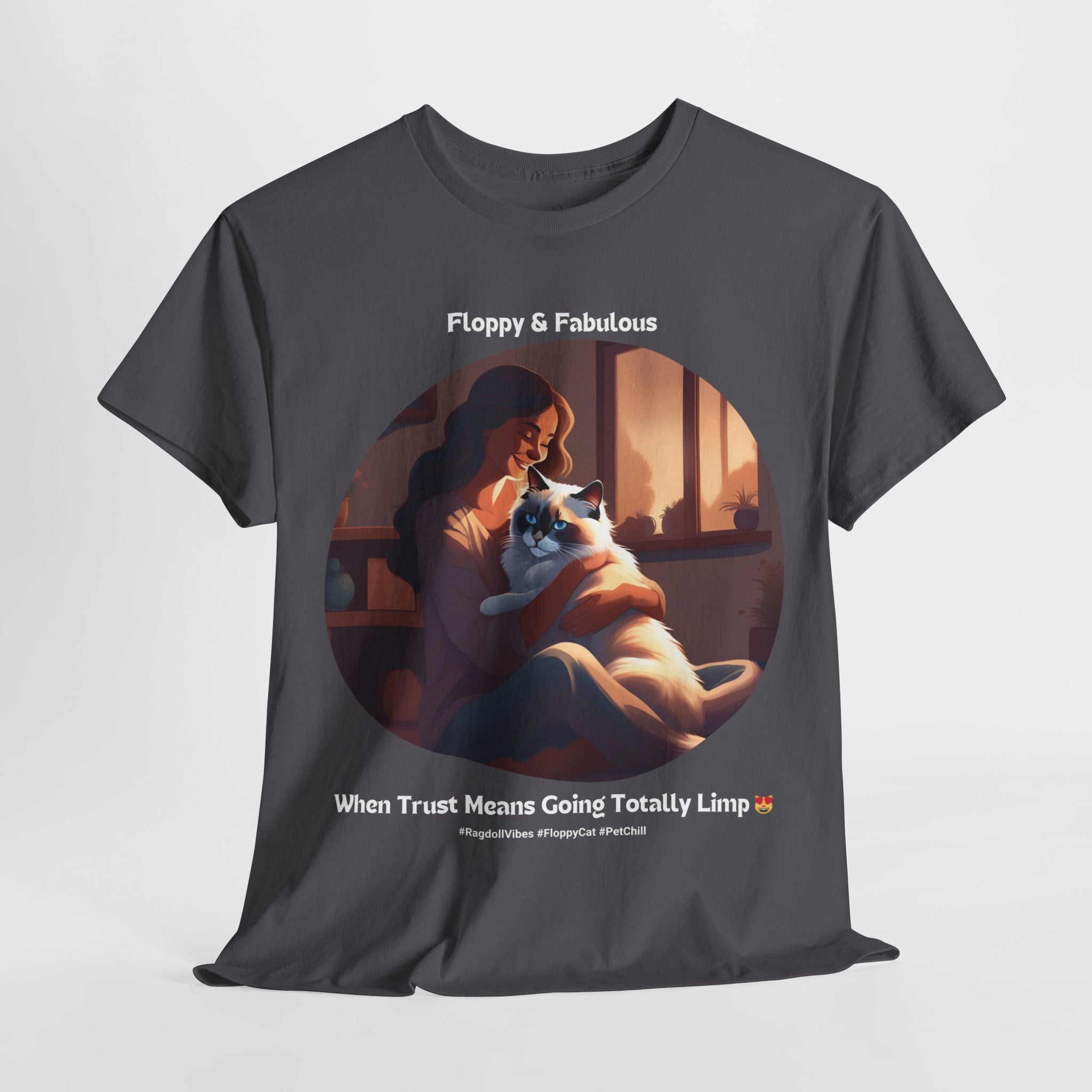 Experience the ultimate in feline relaxation with our Ragdoll t-shirt. This design features a heartwarming image of a human cuddling with a Ragdoll cat, capturing the trust and comfort that these incredible pets bring to our lives.