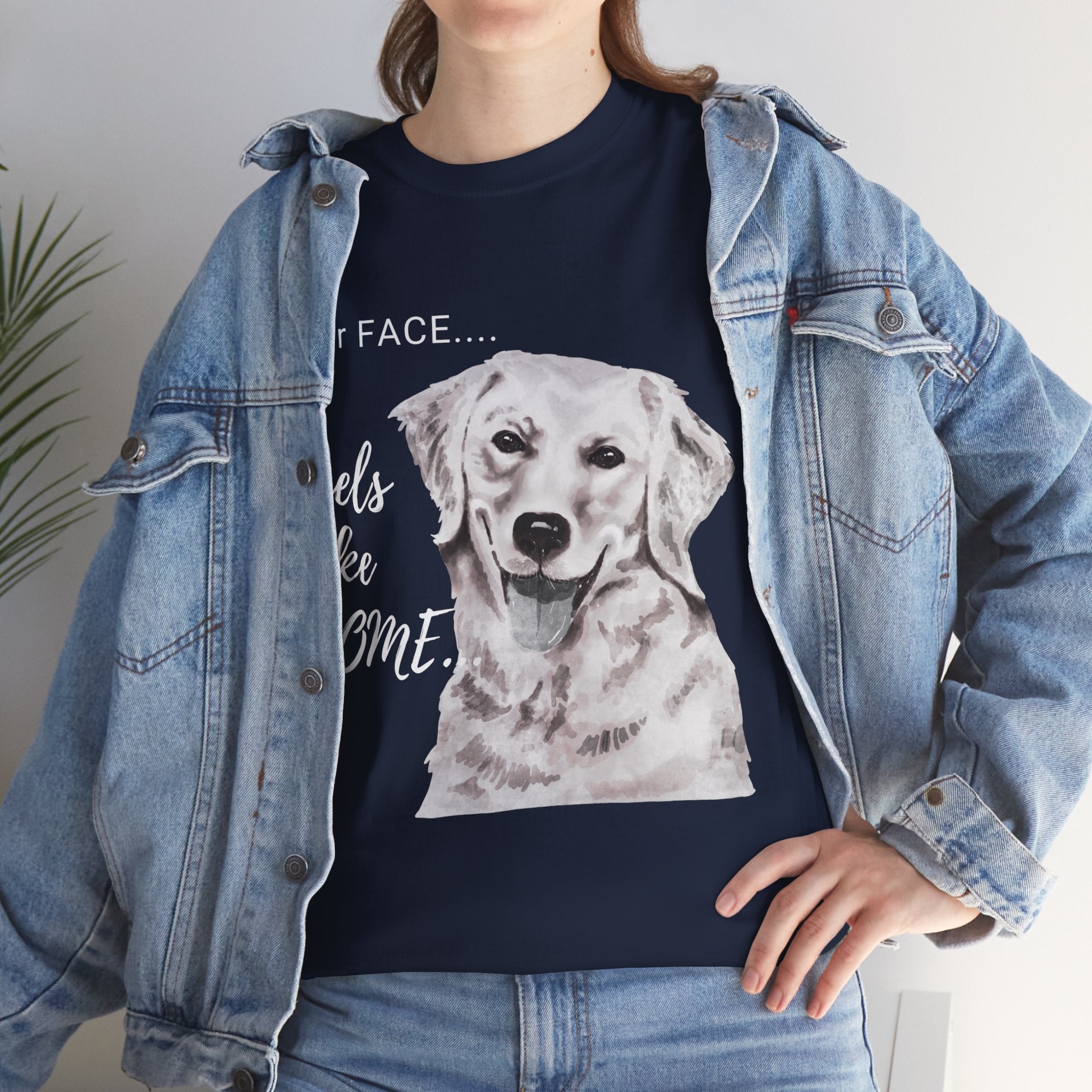 Our Home Sweet Home Dog T-Shirt features a heartwarming design of a dog gazing lovingly upward with a soft, gentle expression. The text "Your face feels like home" perfectly captures the deep bond between a dog and their owner.